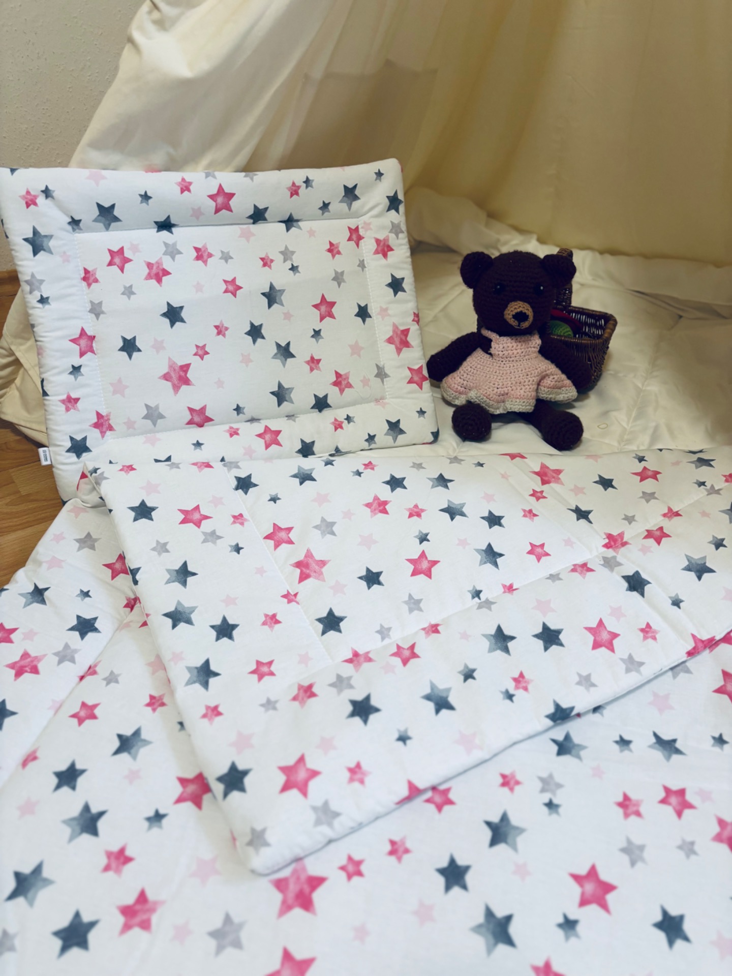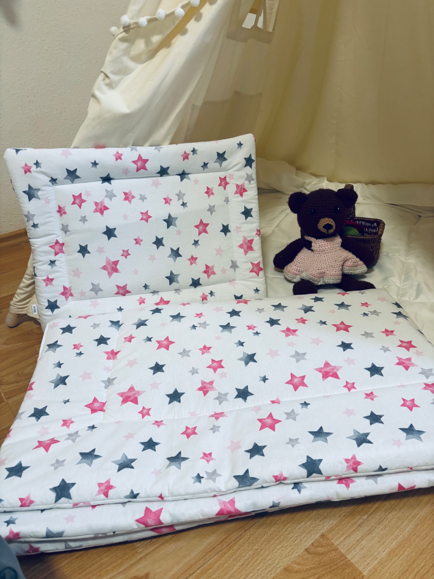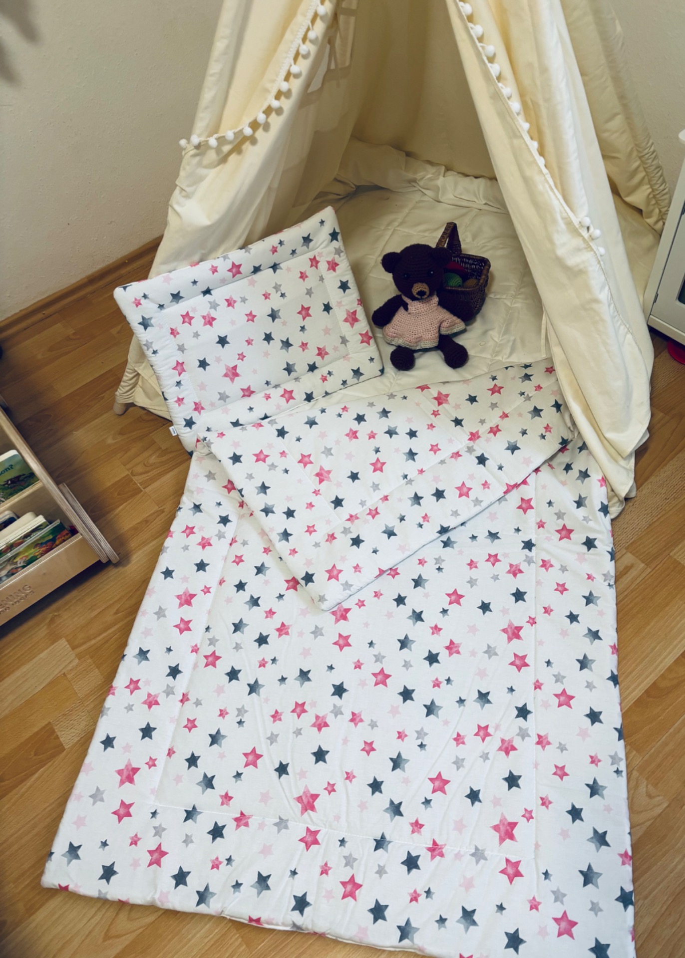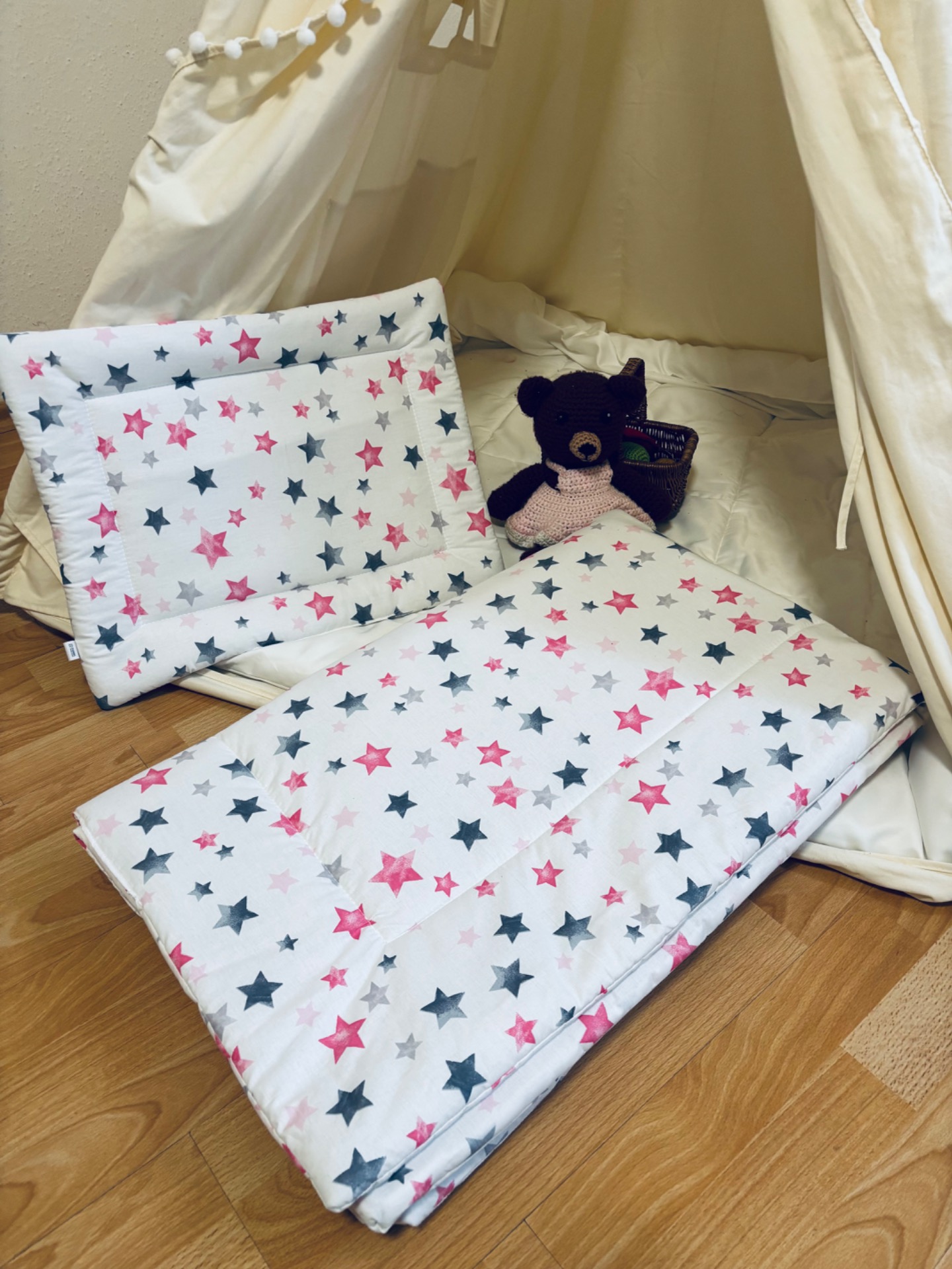 A párna és a takaró mindkét oldala pamutvászon anyagból készült közte 300 gramm vatelin töltettel.