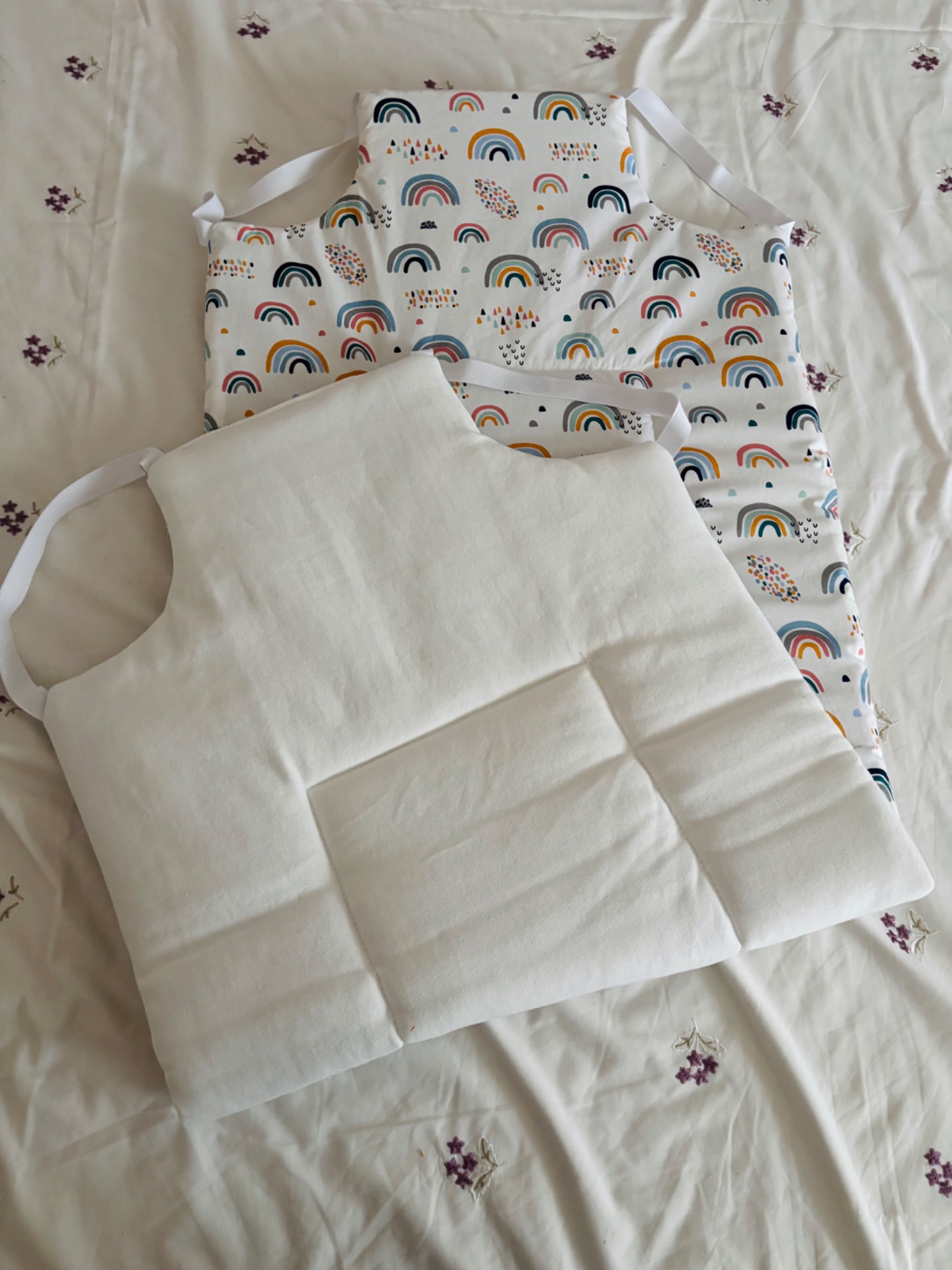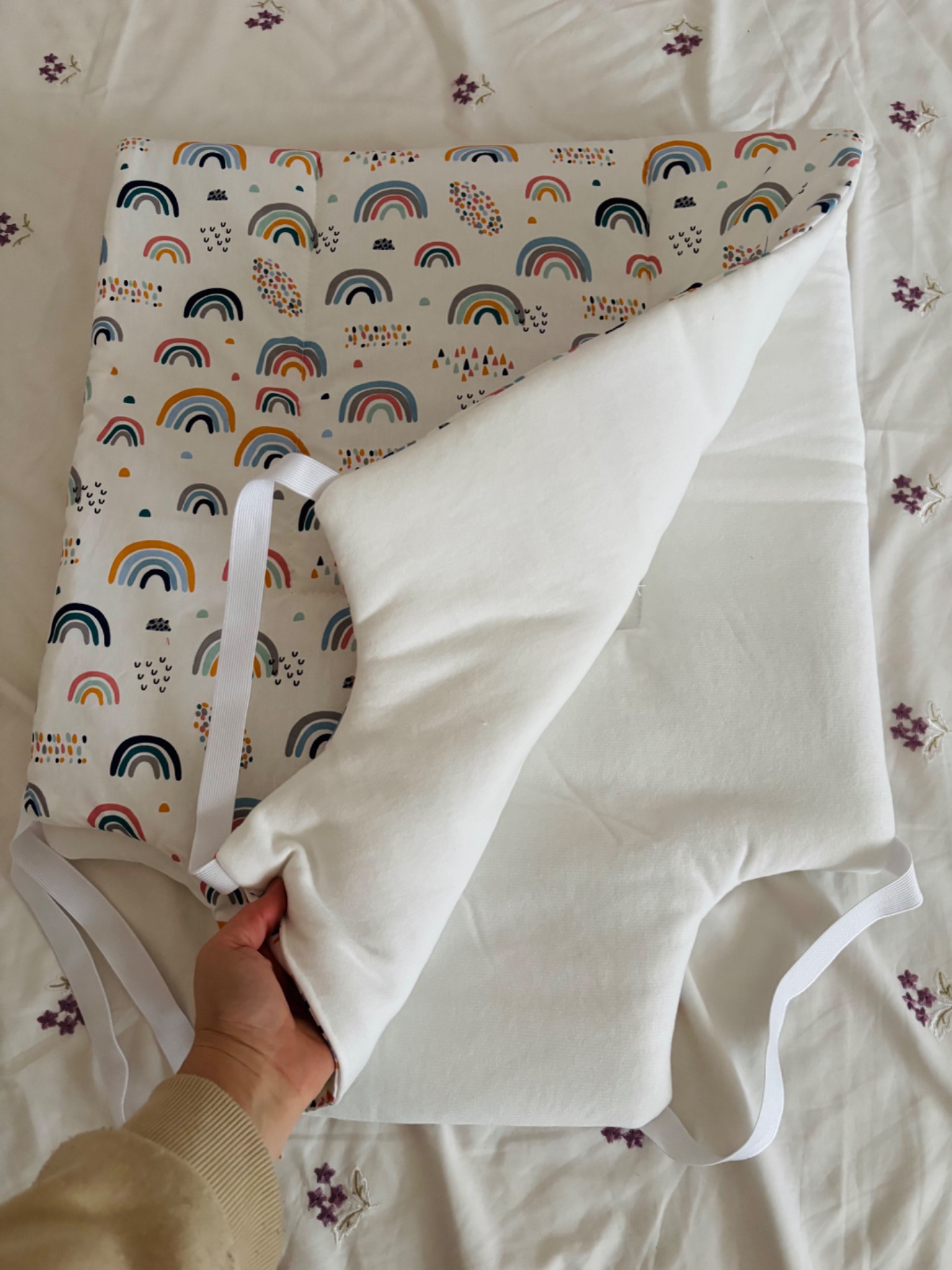 Mindkét oldala pamutból kèszült, közte vatelin töltet, oldalán gumikkal rögzített.