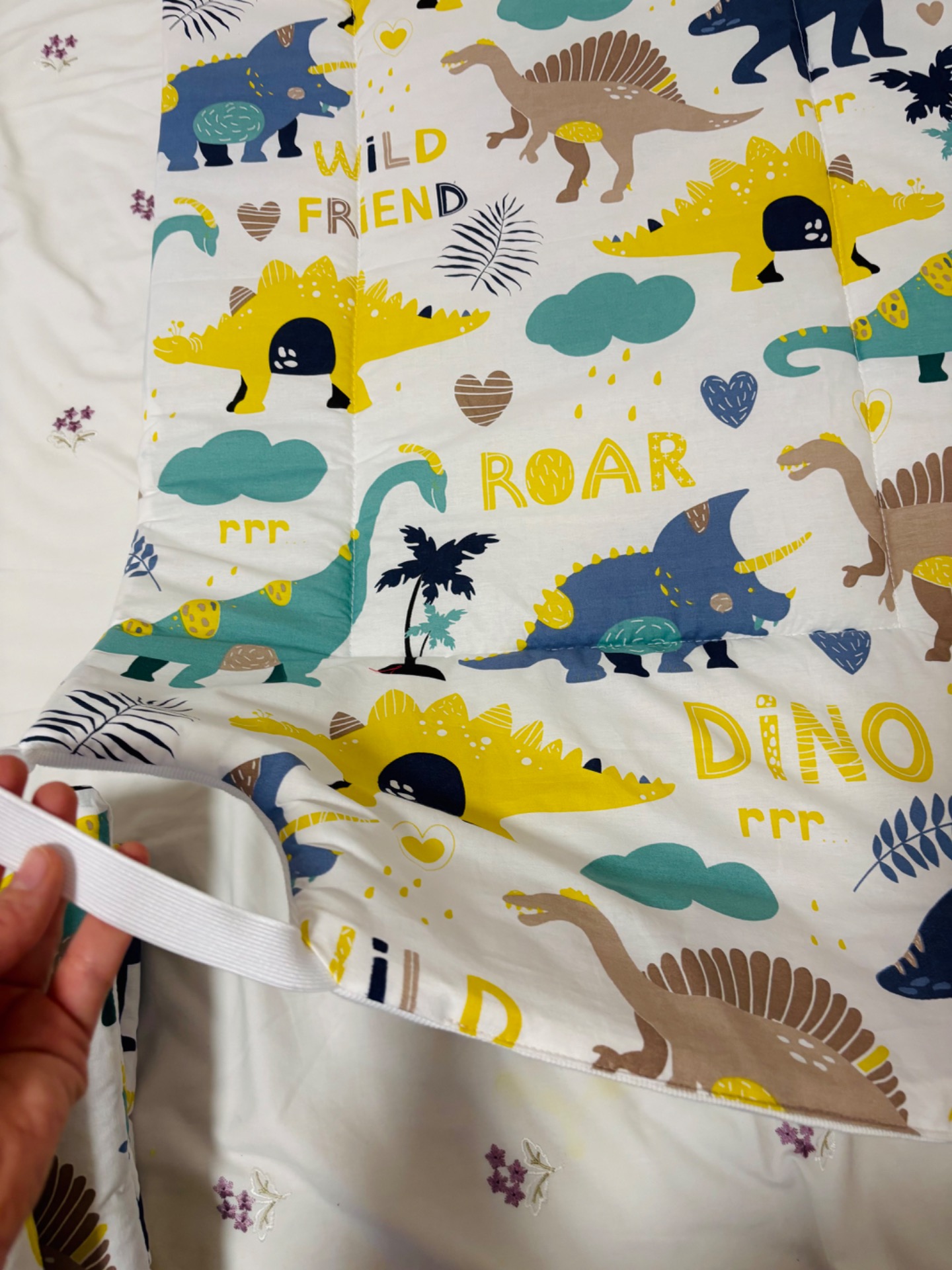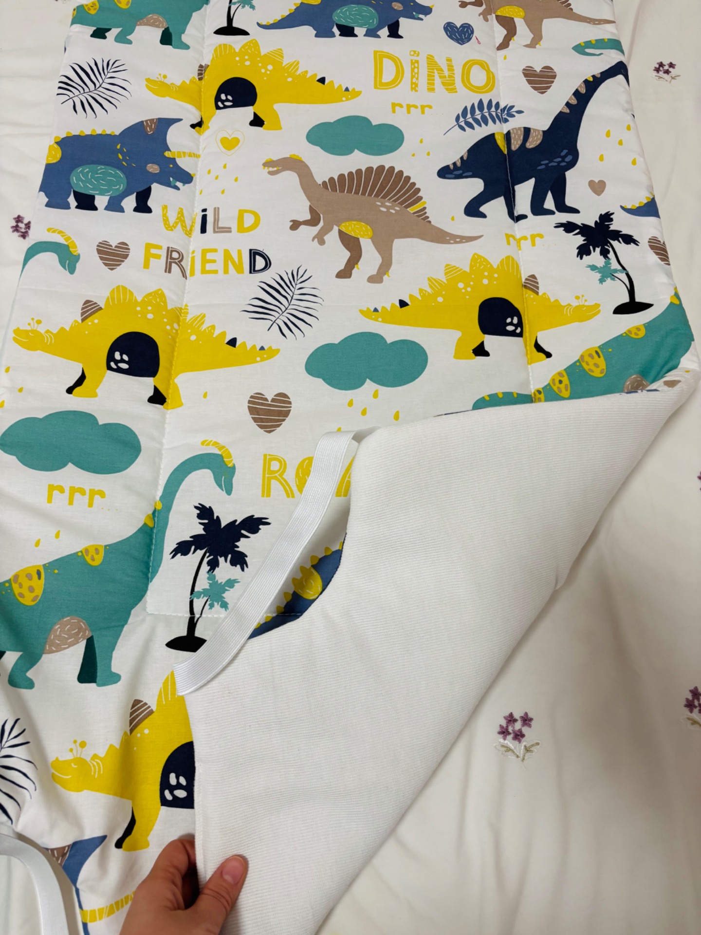 Mindkét oldala pamutból kèszült, közte vatelin töltet, oldalán gumikkal rögzített.