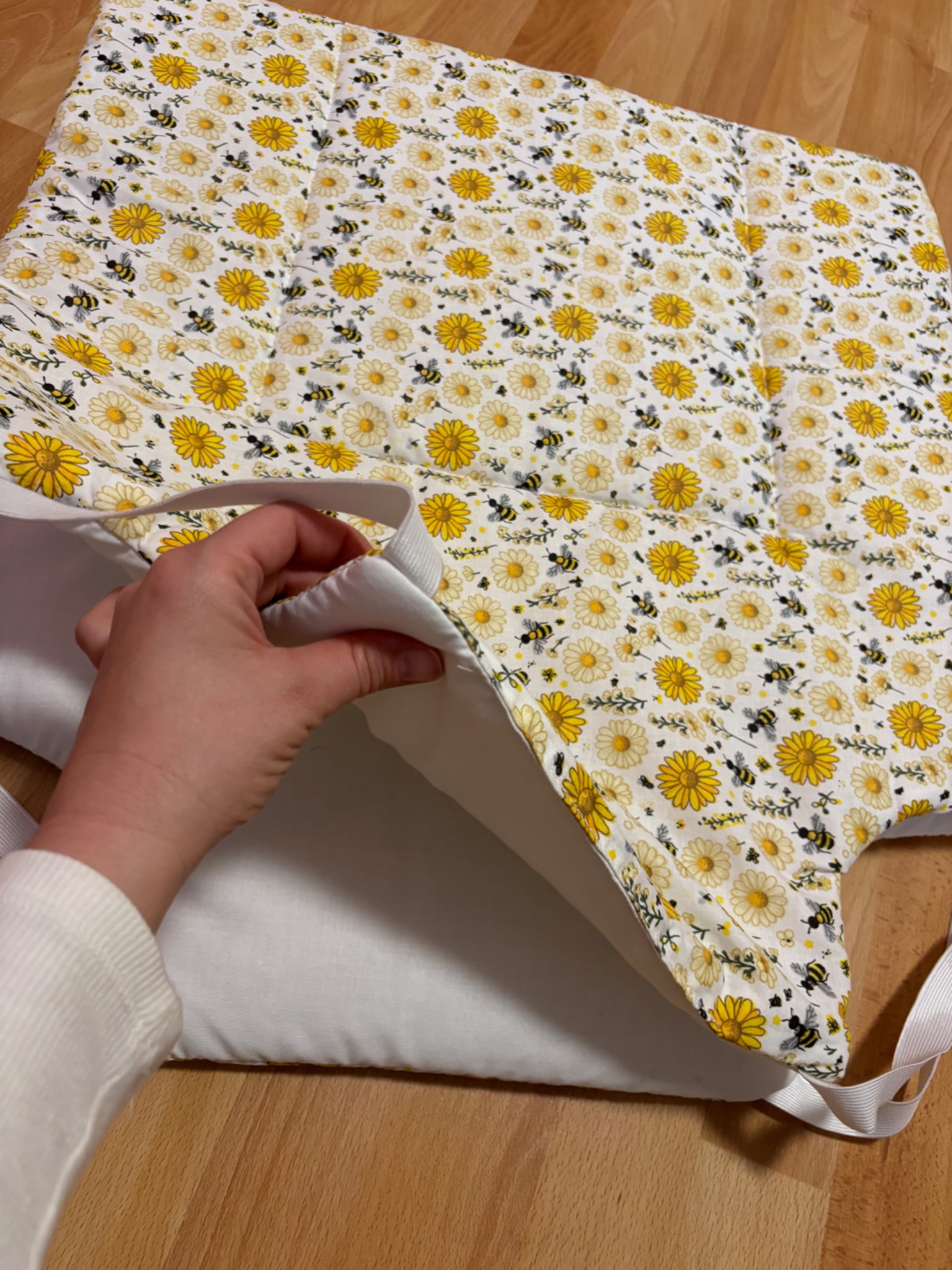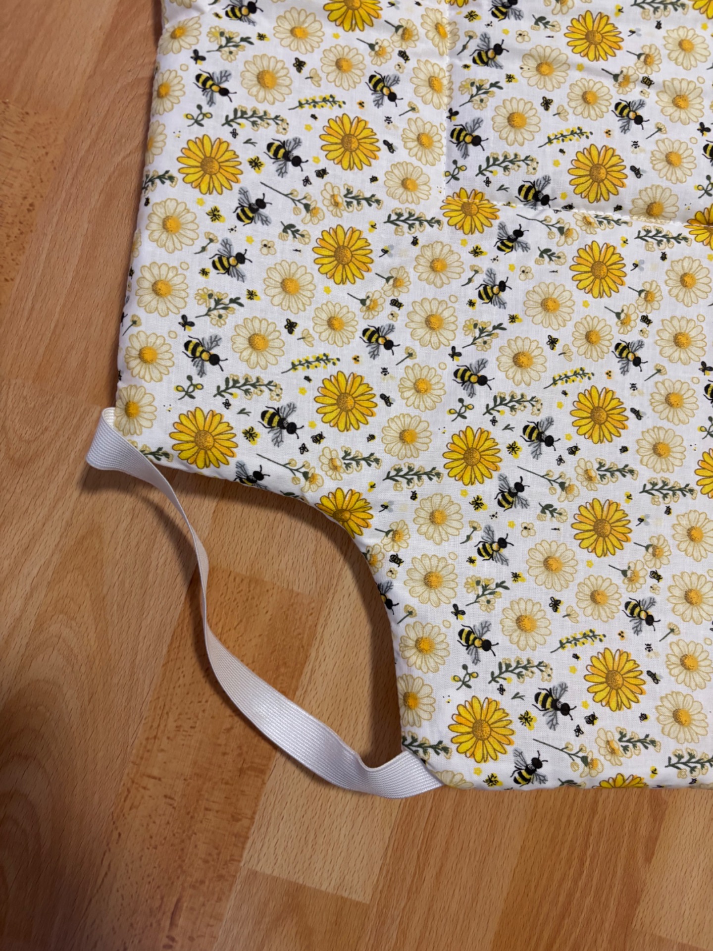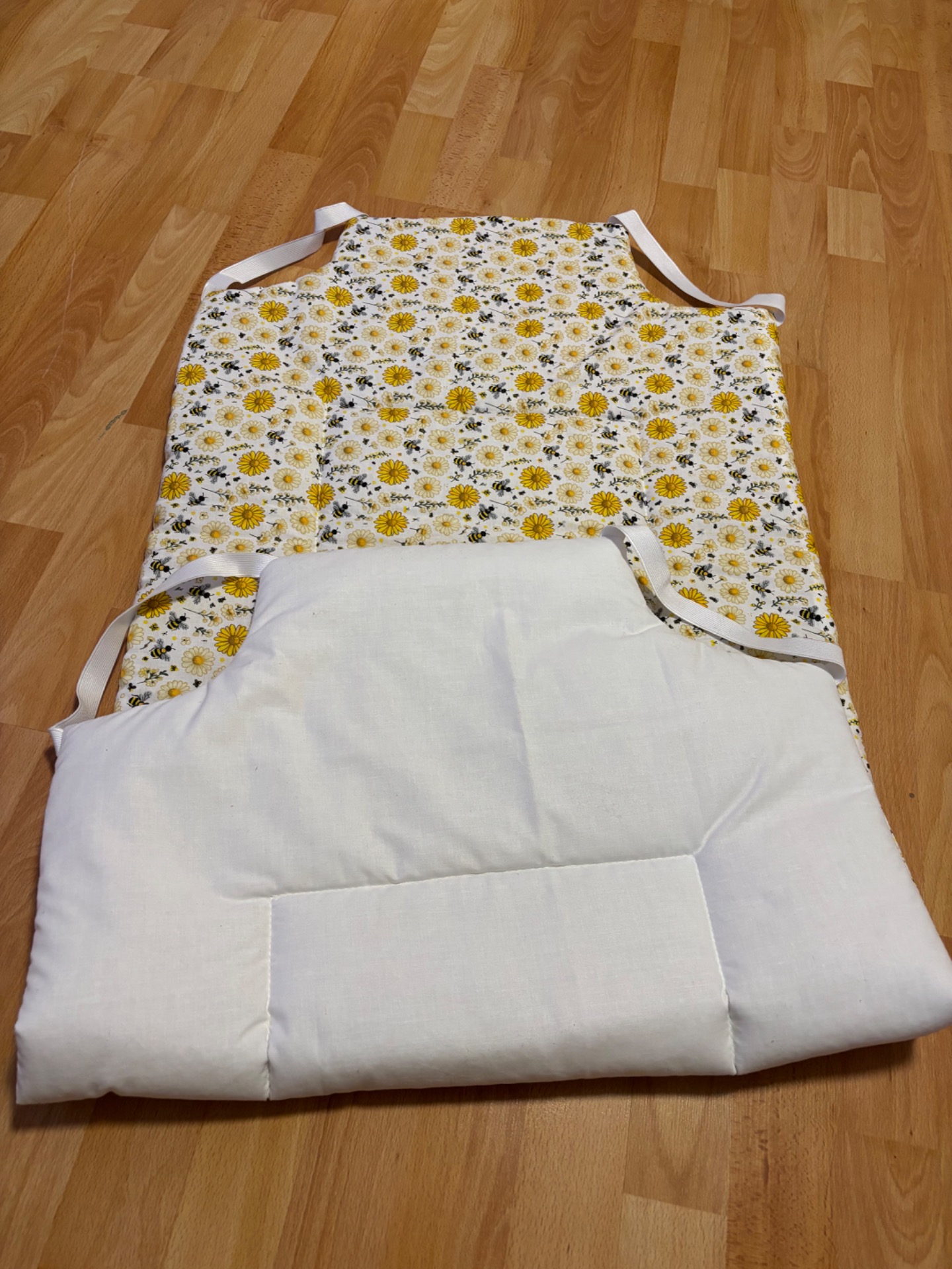 Mindkét oldala pamutból kèszült, közte vatelin töltet, oldalán gumikkal rögzített.