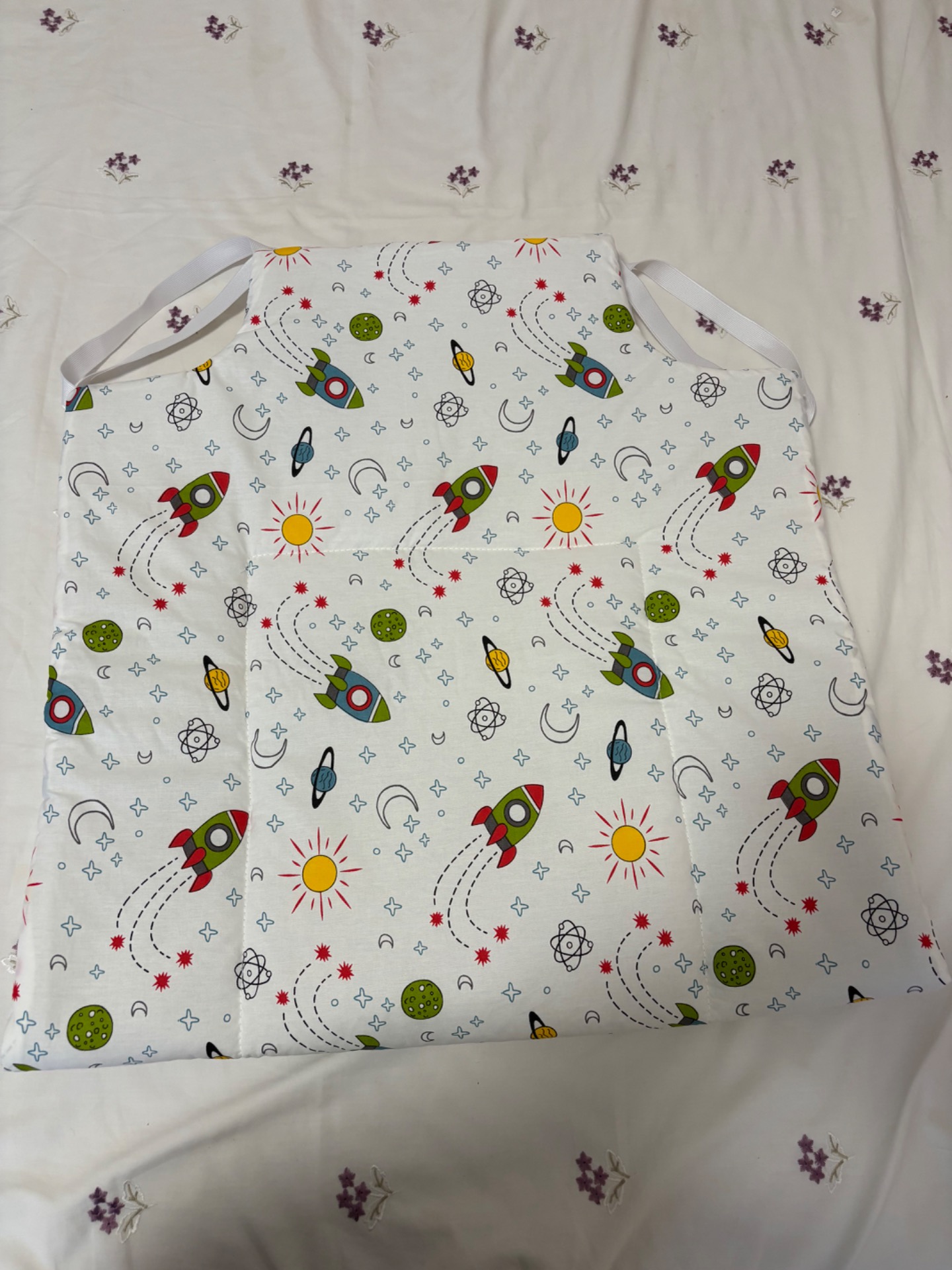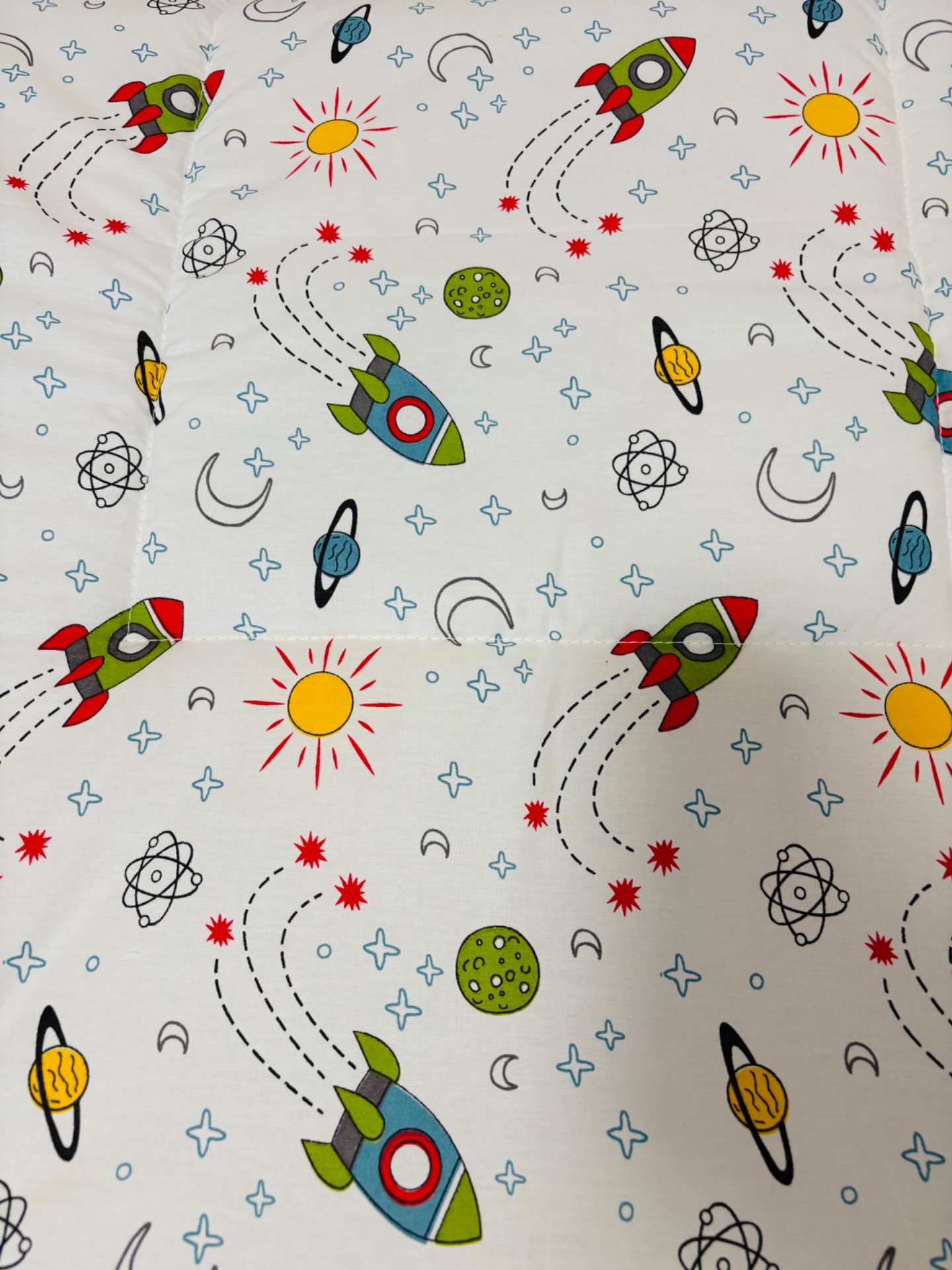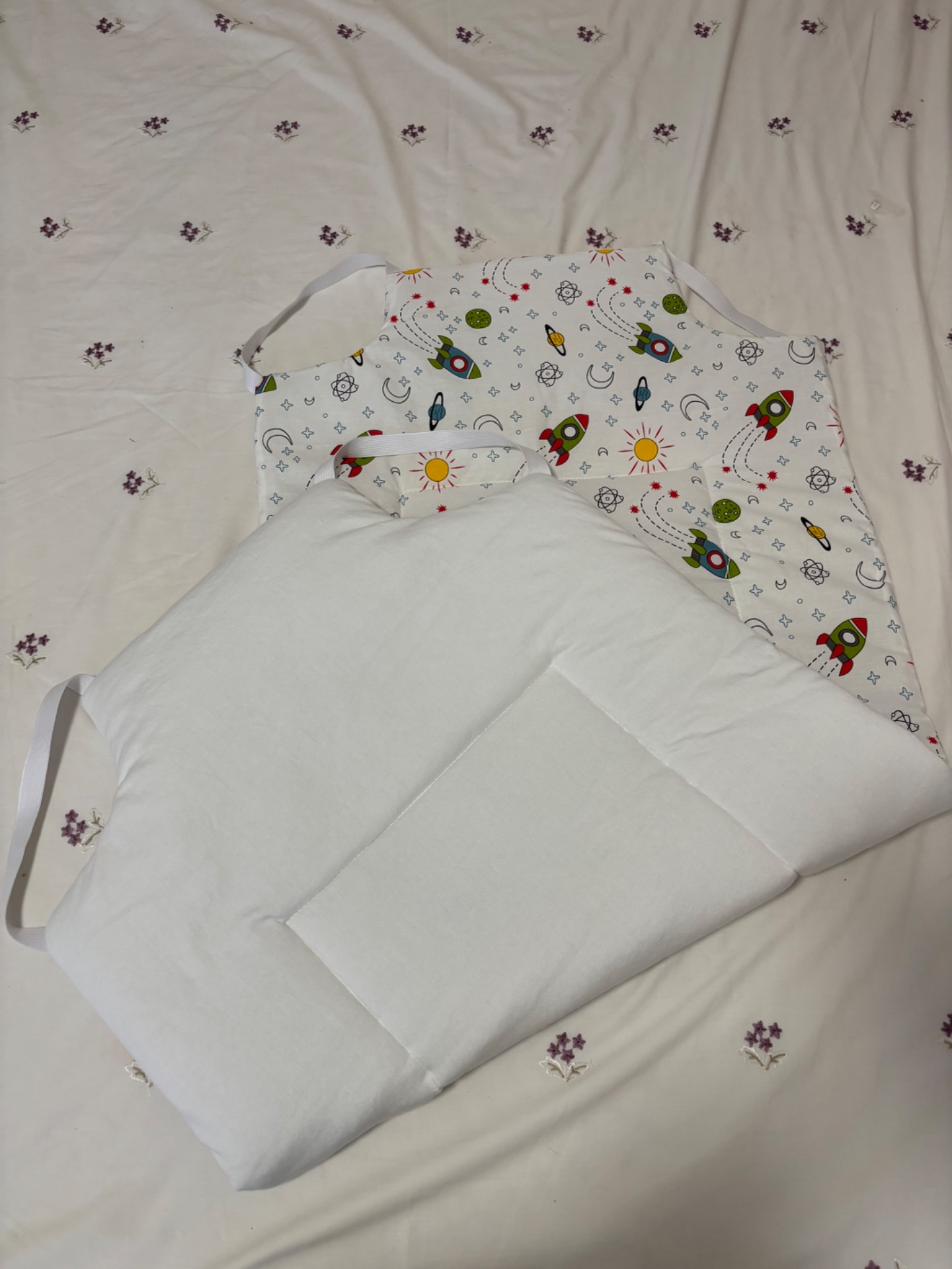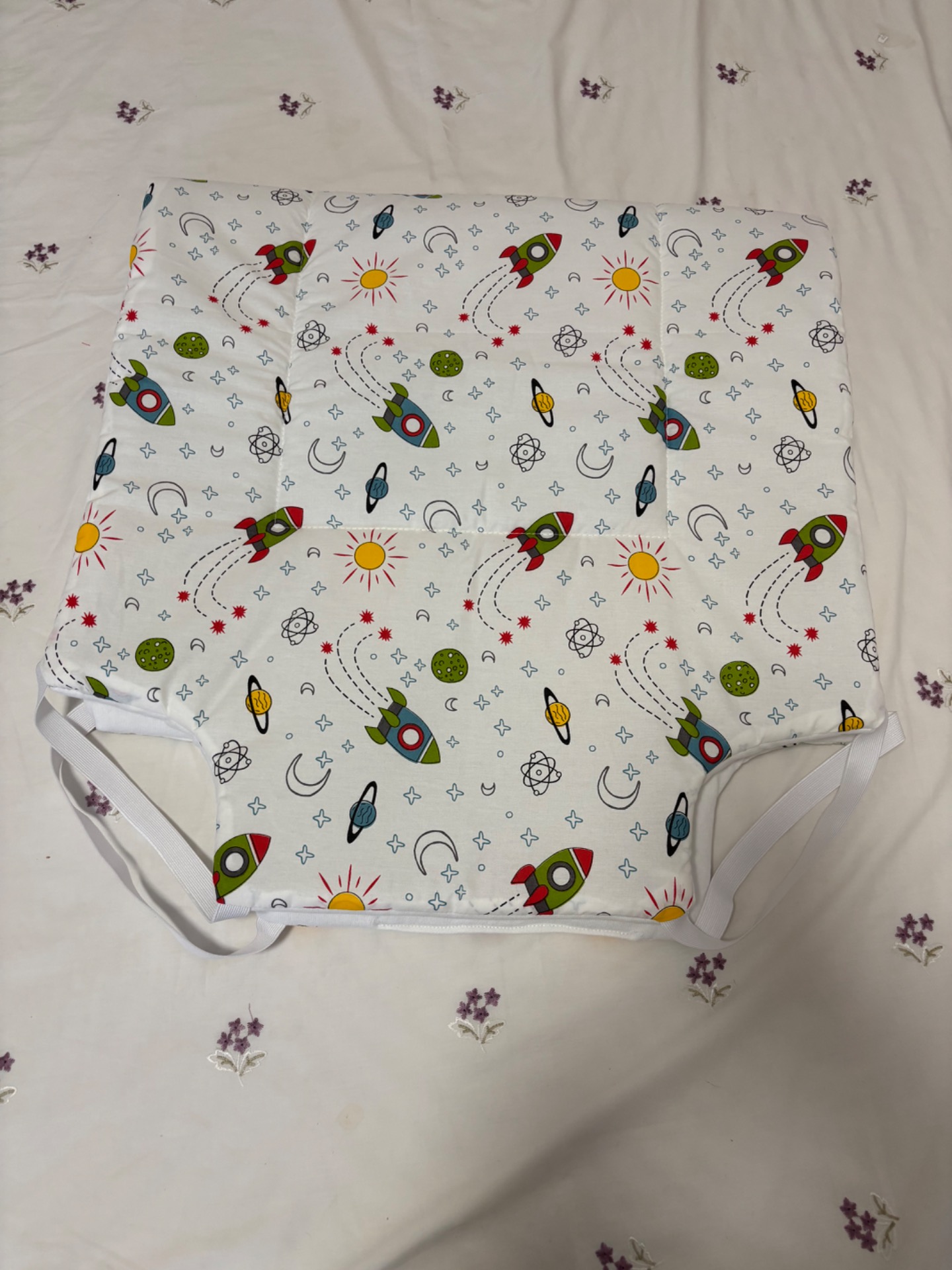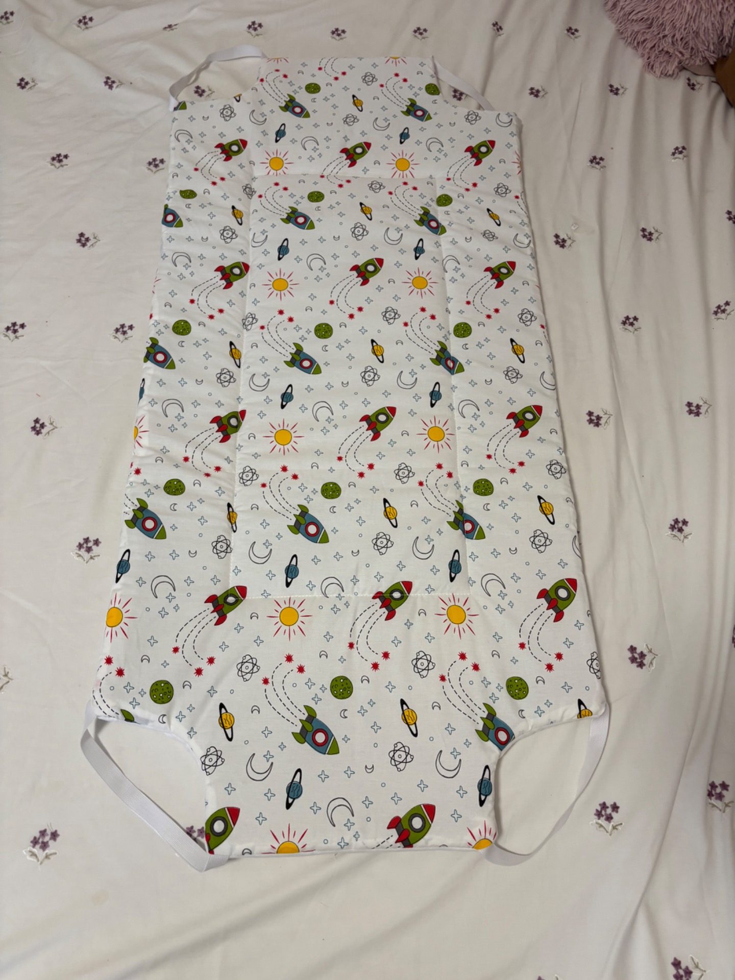 Mindkét oldala pamutból kèszült, közte vatelin töltet, oldalán gumikkal rögzített.