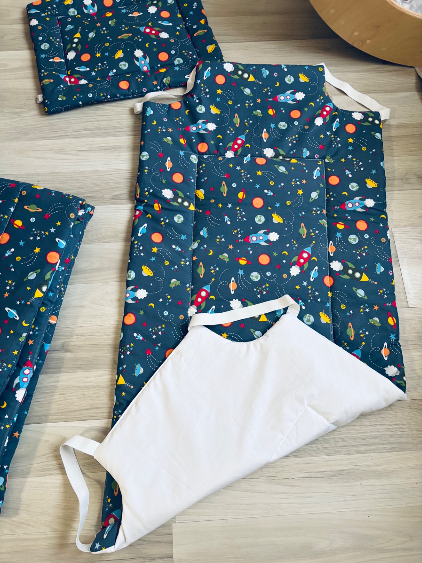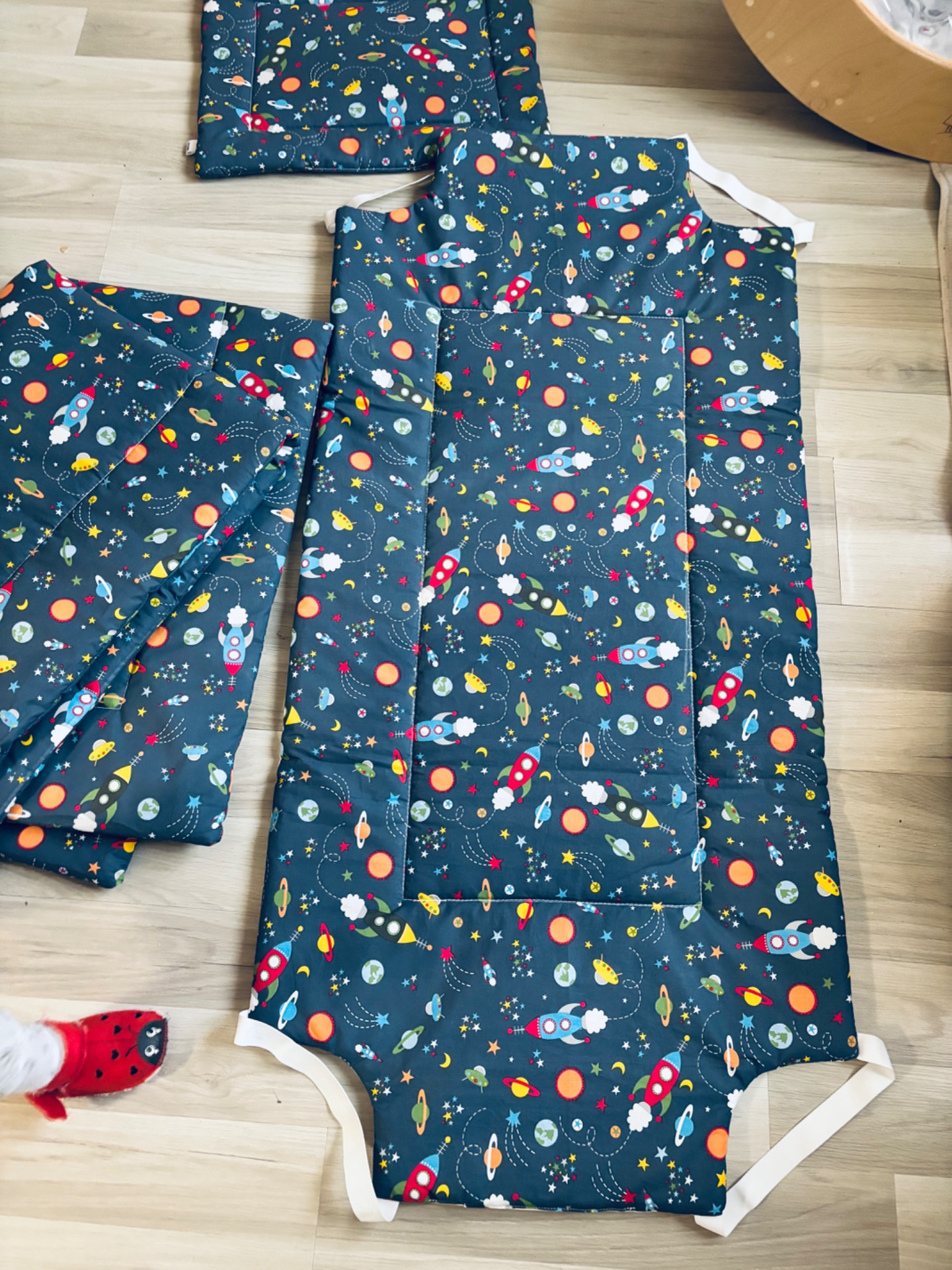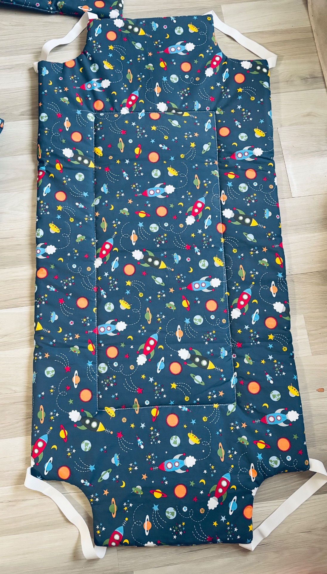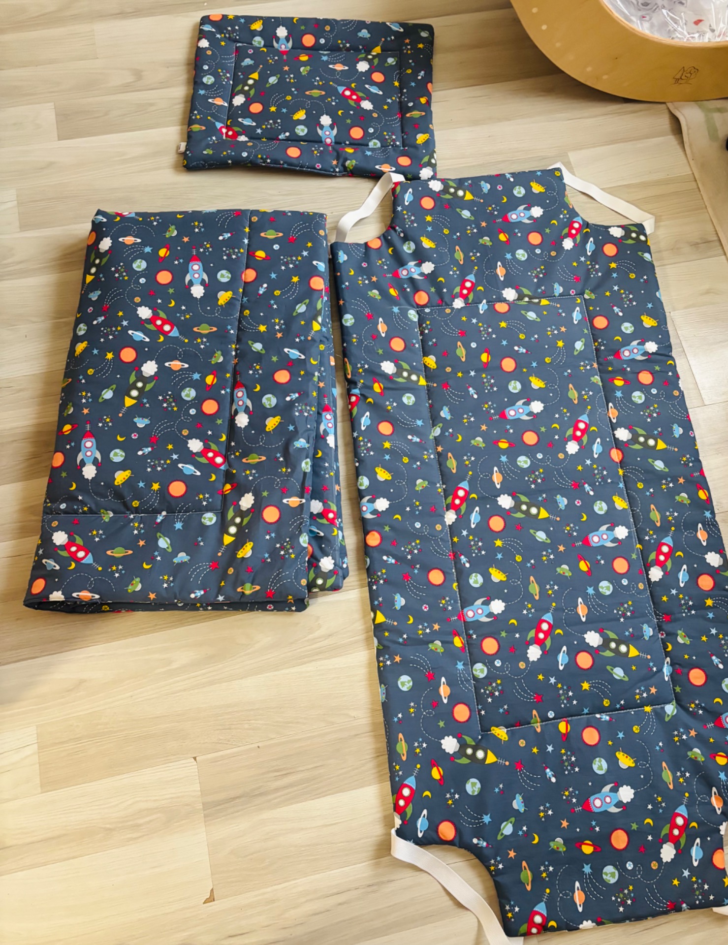 Mindkét oldala pamutból kèszült, közte vatelin töltet, oldalán gumikkal rögzített.
