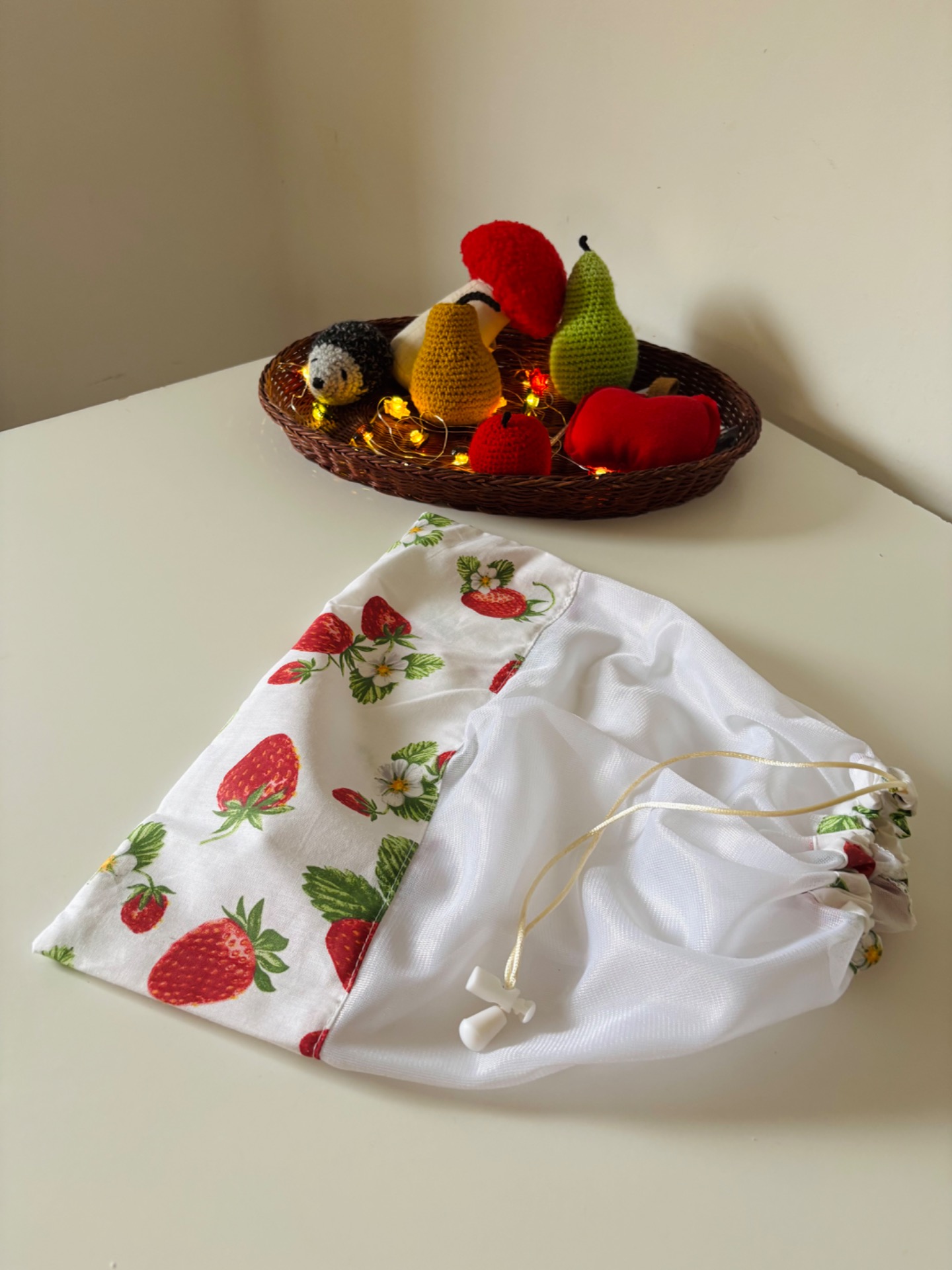 Pamutvászon és háló felhasználásával készült pillekönnyű , 2-3 gramm súlyú. Nagyon sokáig használható, mosógépben mosható, a pamutvászon része vasalható.
