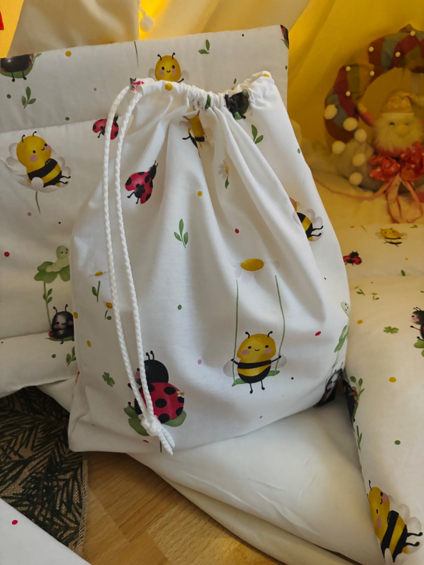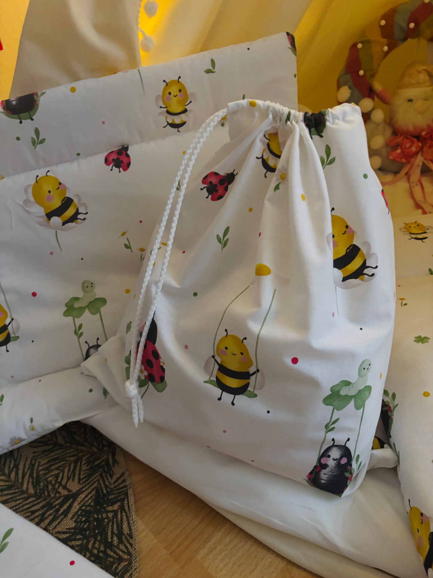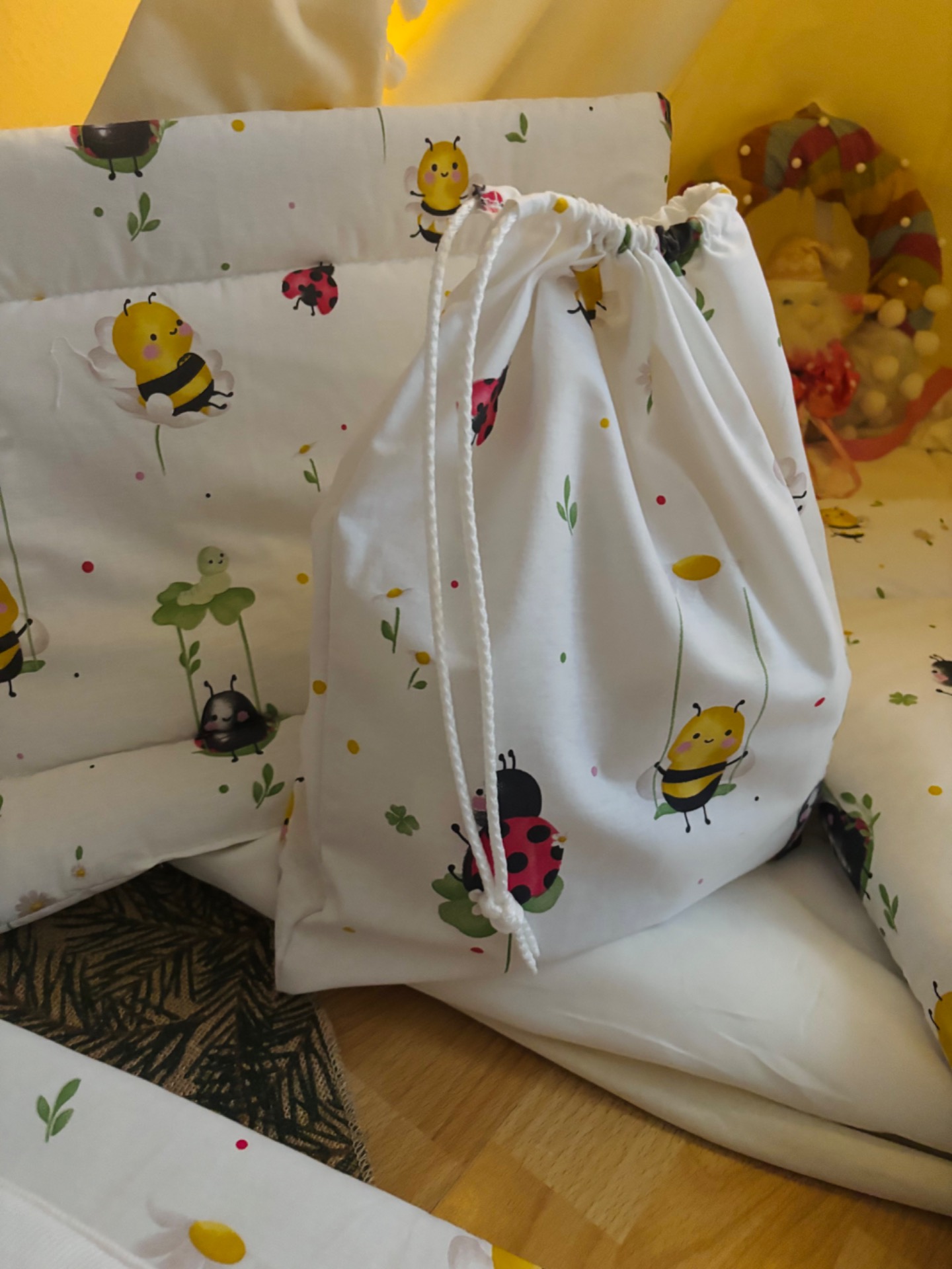 Pamutvászon anyagból készült, tetején húzózsinorral.