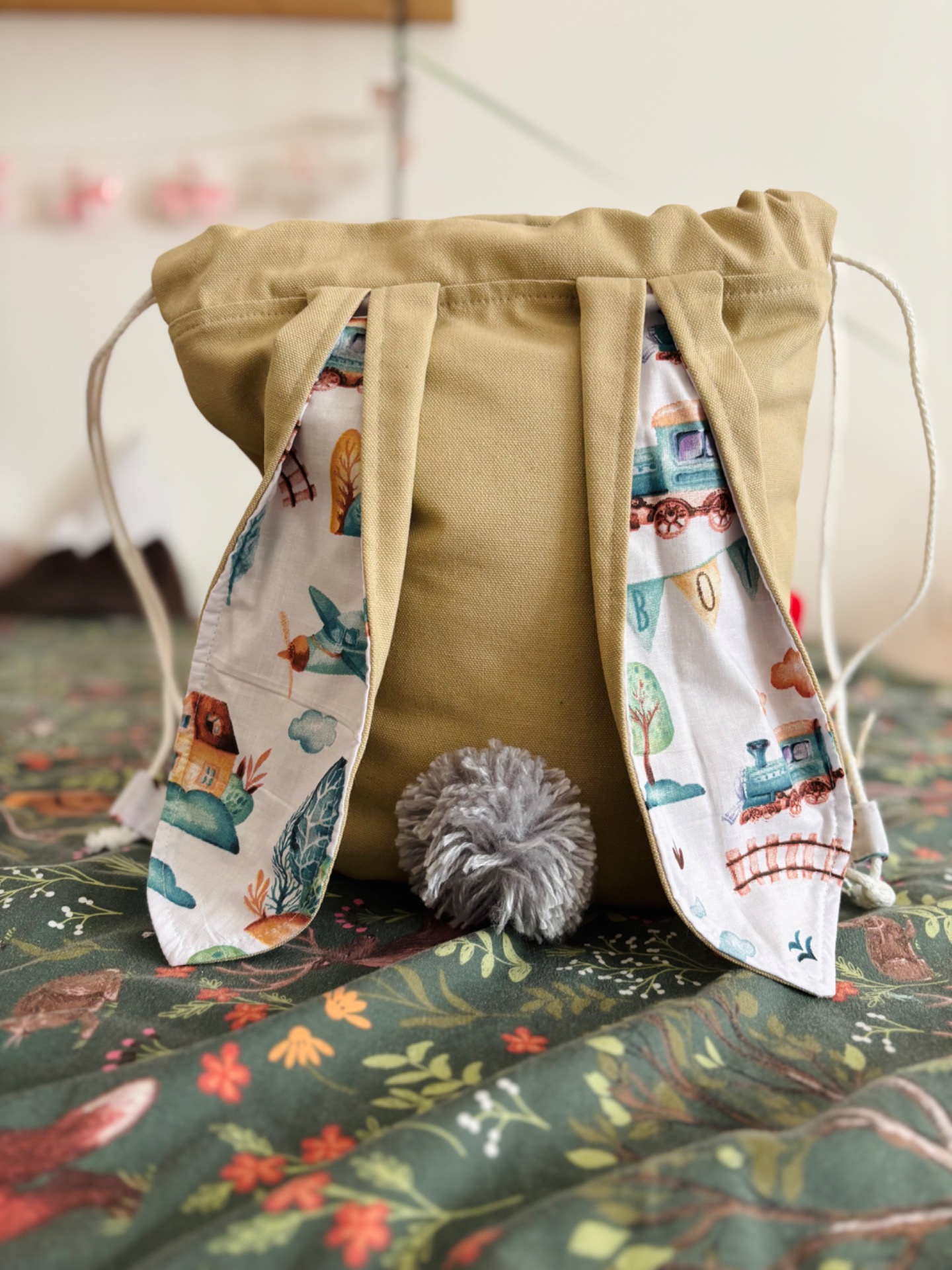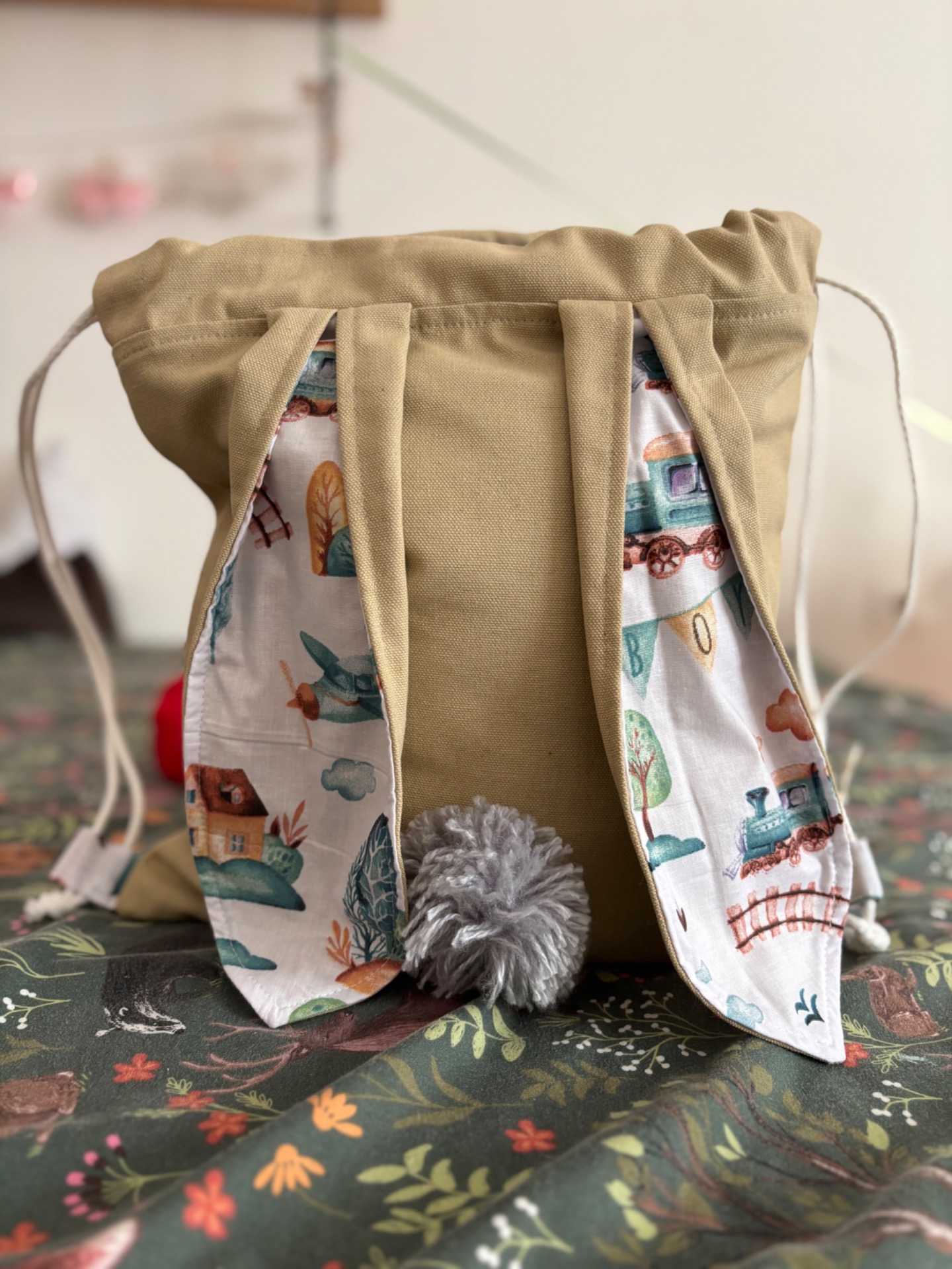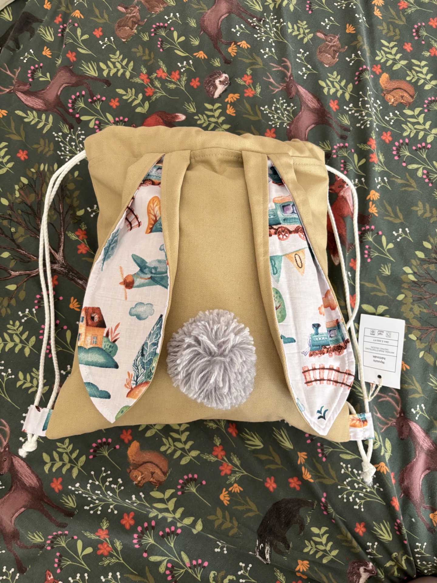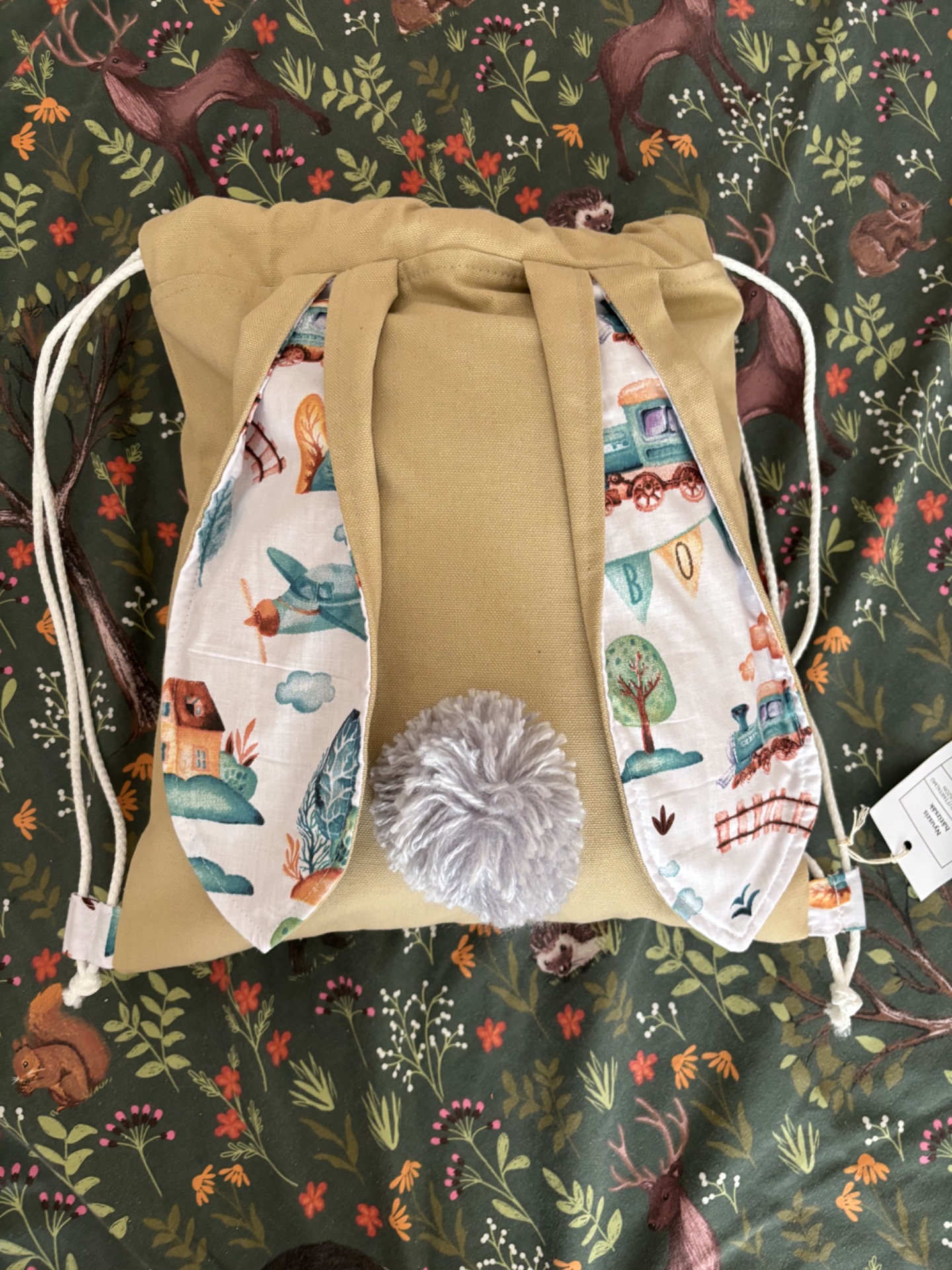 Anyaga pamut tartalmú vastag vászon, bélése pamutvászon. 40 fokon mosható mosógépben szárítógépben szárítható, vasalható.