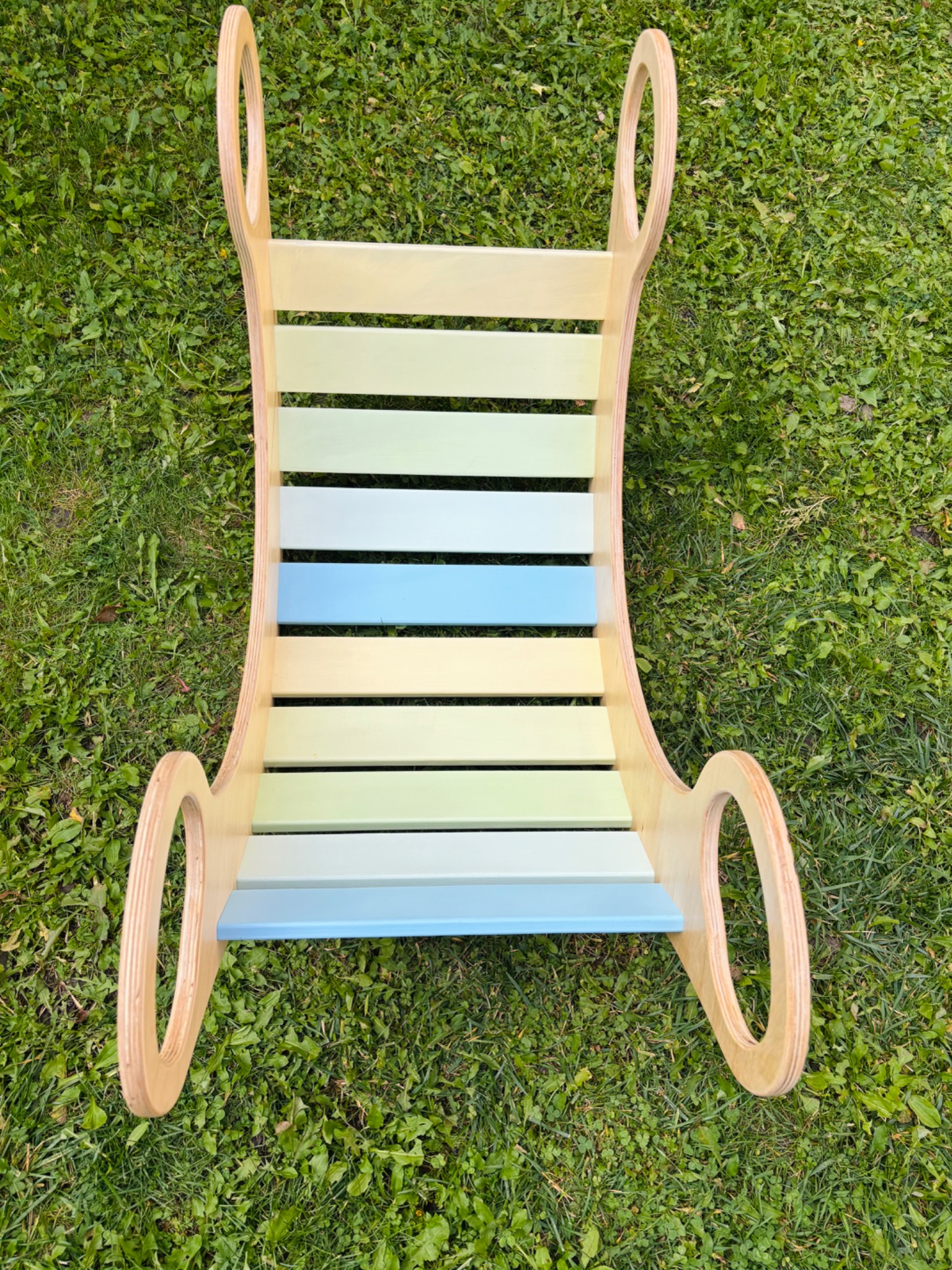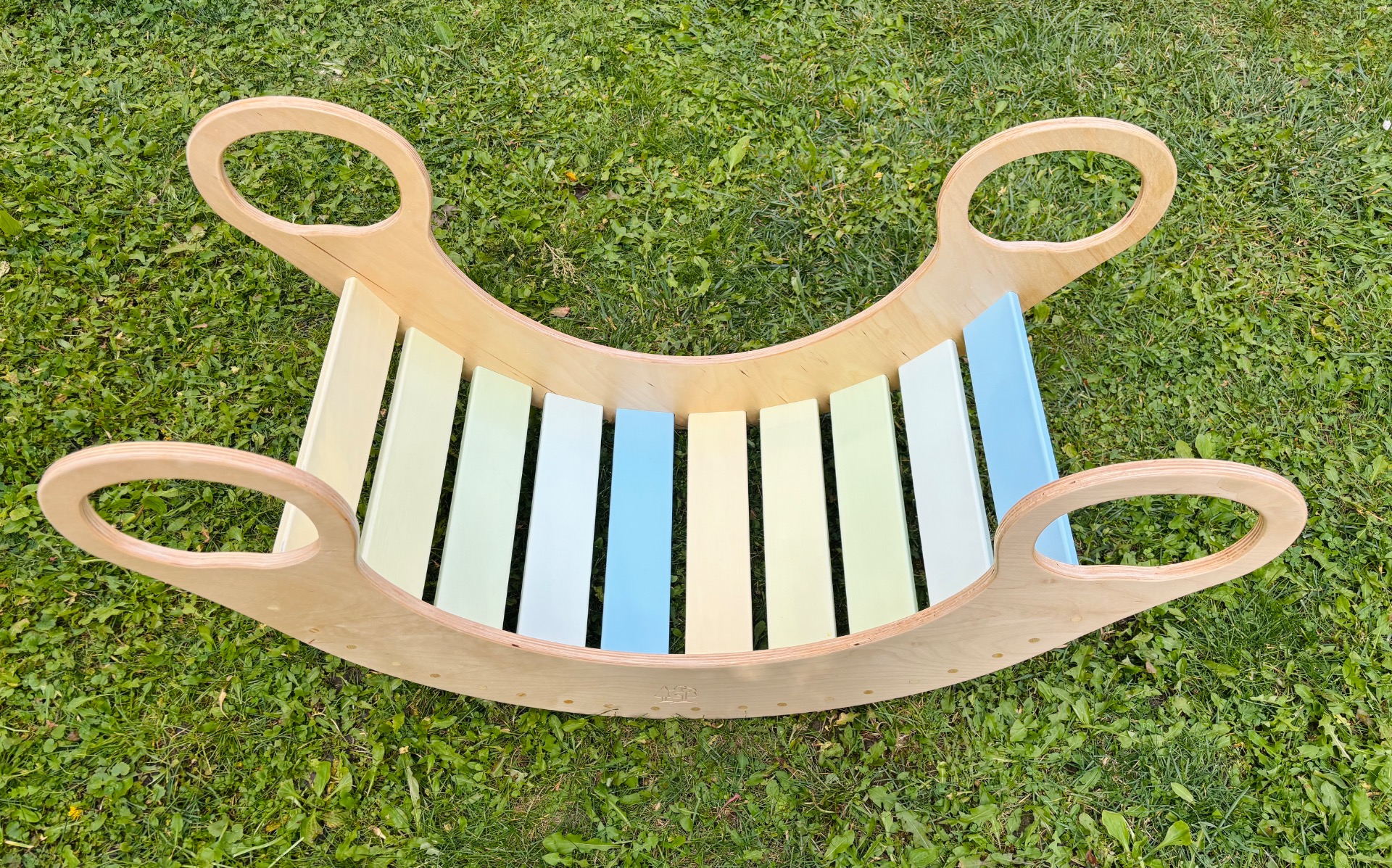 A szivárványhinta 15 mm-es nyír rétegelt lemezből készült. Mindegyik deszkát csavarral rögzítettük, majd elfedtük, így esztétikus látványt nyújt a szemnek. A hinta oldalait ásványi olaj és méhviasz keverékével kezeltük, a fokokat gyerekbarát lakkal fedtük be.(EN 71/3 szabványnak megfelelő).