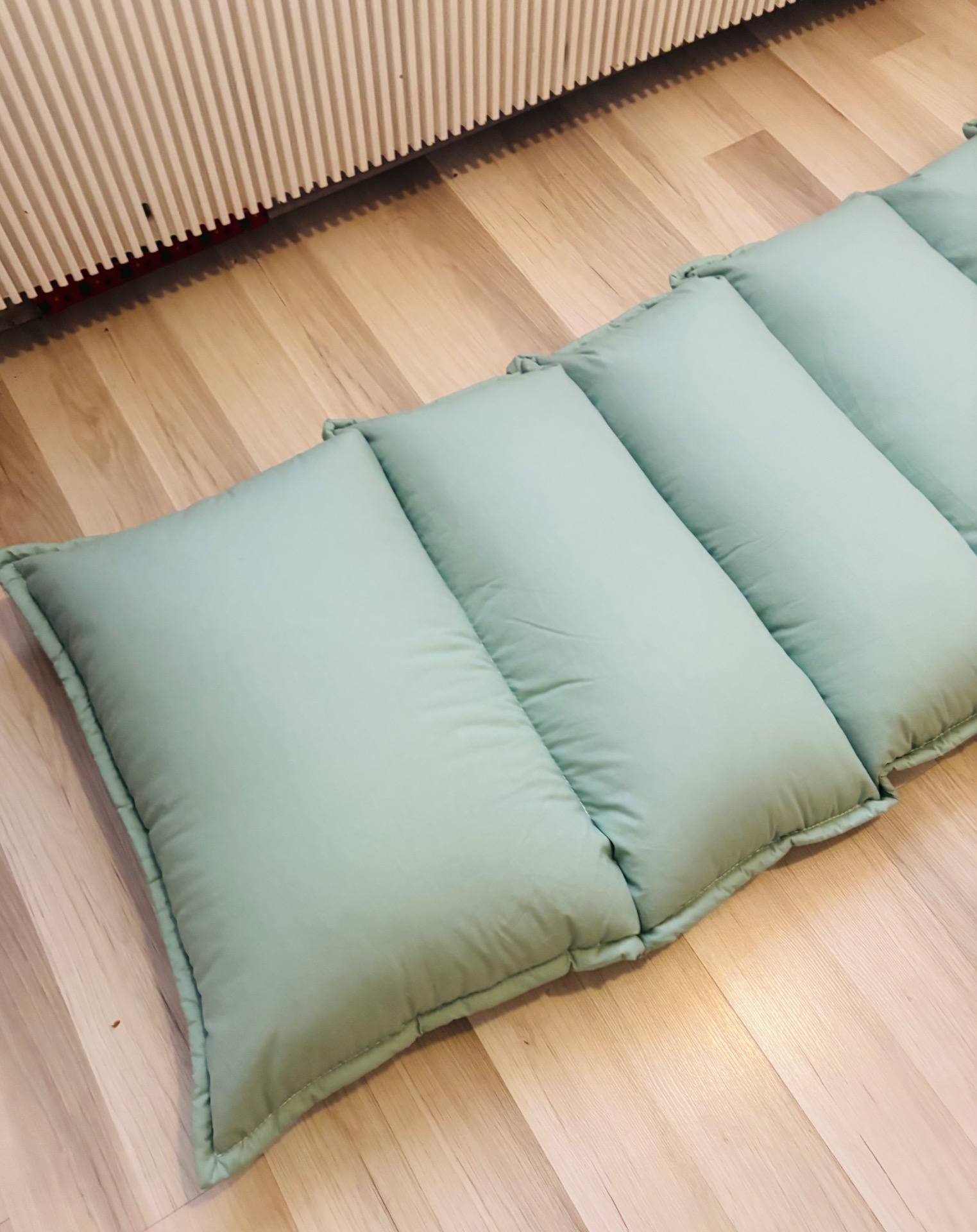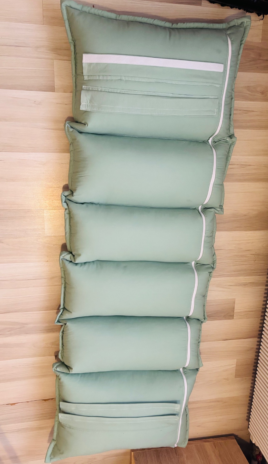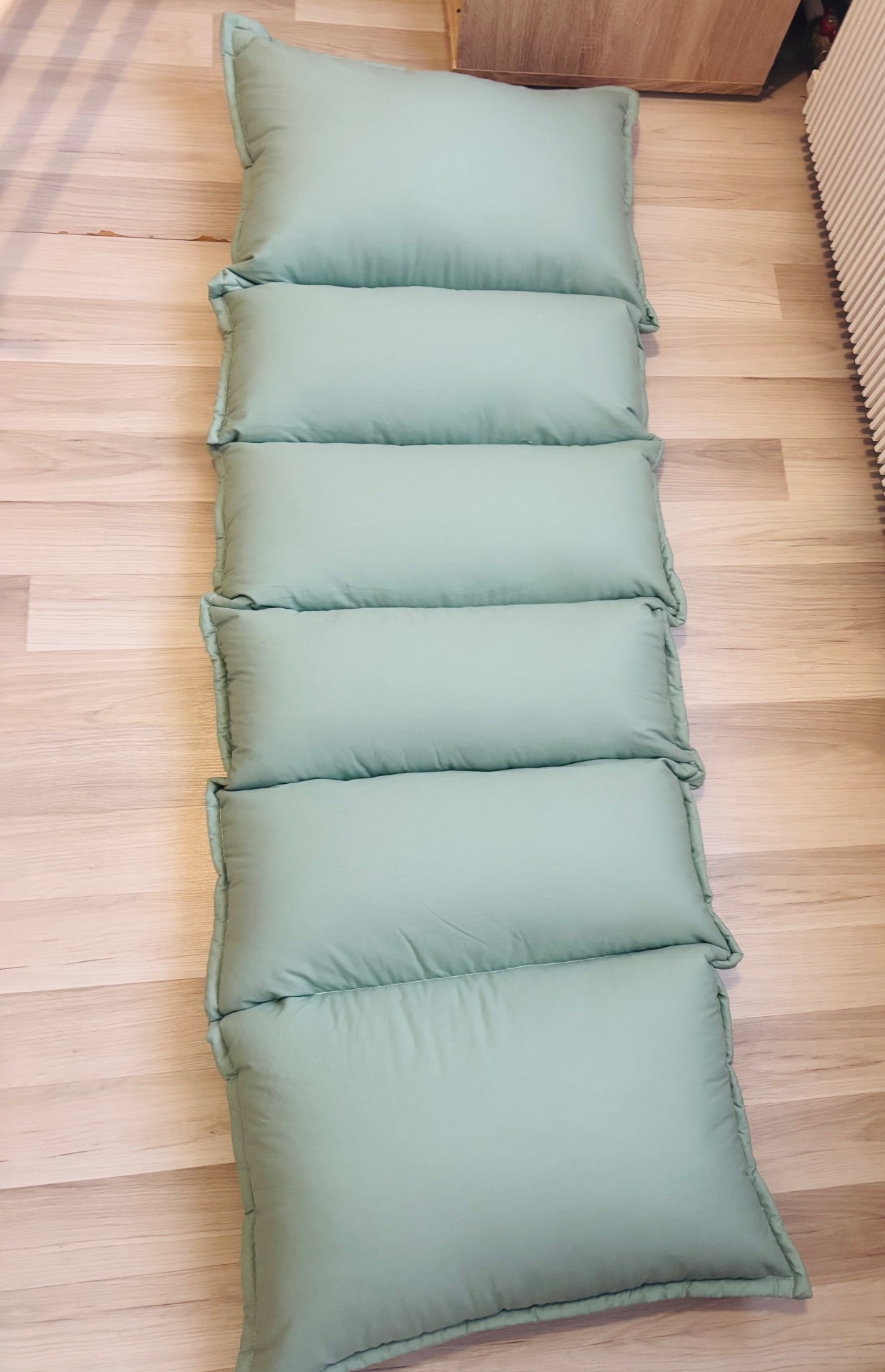 Felnőtt óriás hintába való vastag párna. Mindkét végen egy vastagabb párna résszel. Két rúdhoz tépőzárral lehet rácsatolni. Külső pamut huzata lecipzározható, mosógépben mosható, szárítható, vasalható.