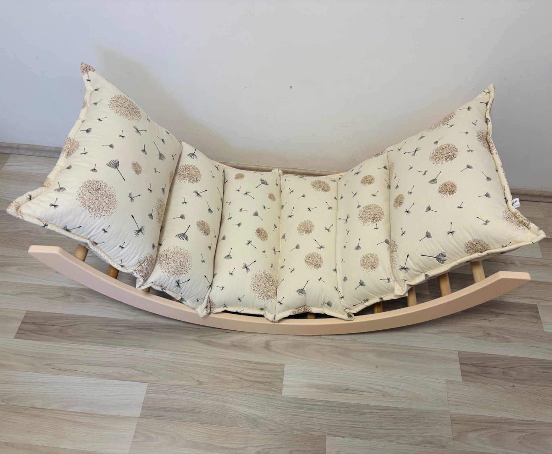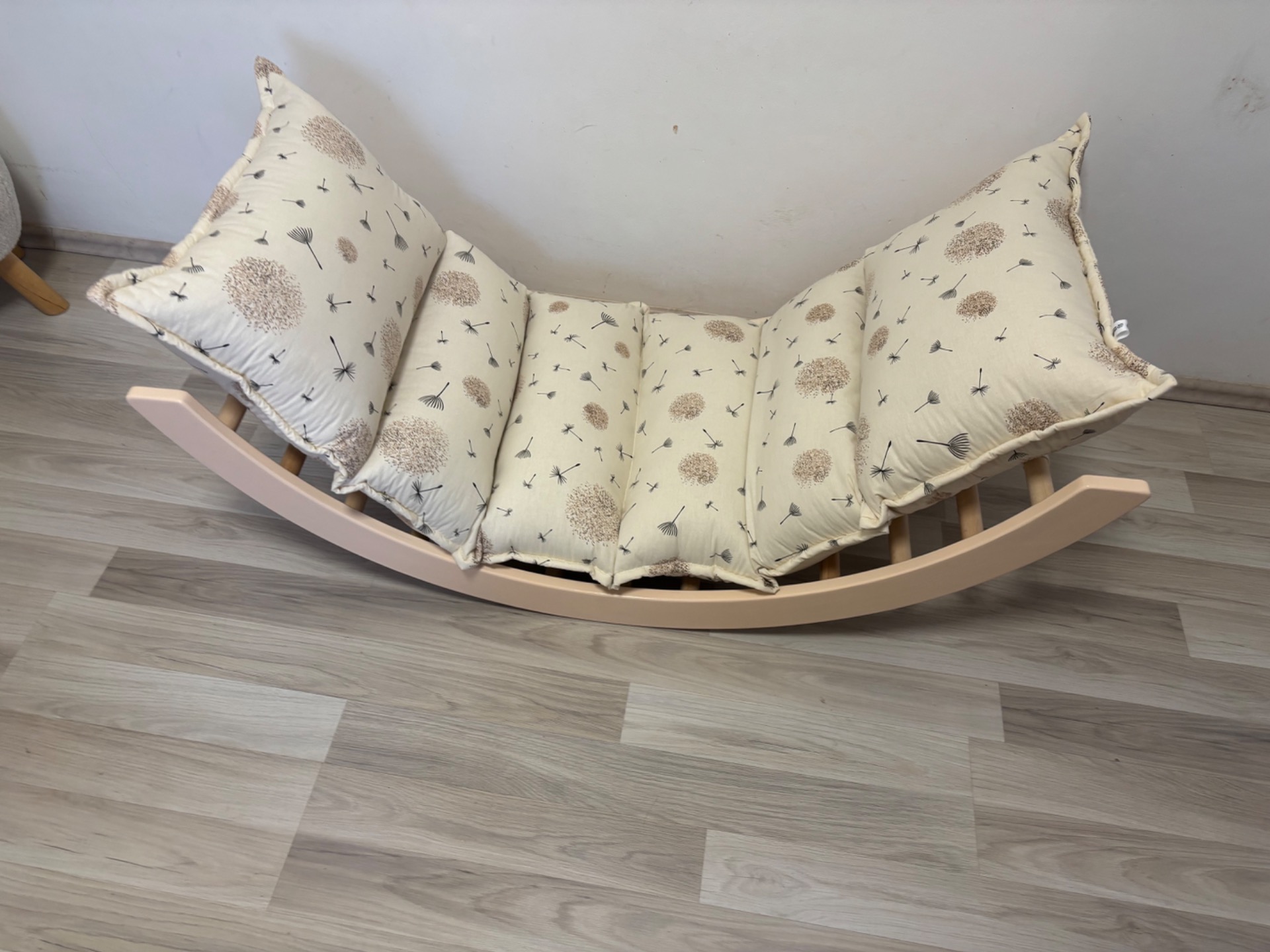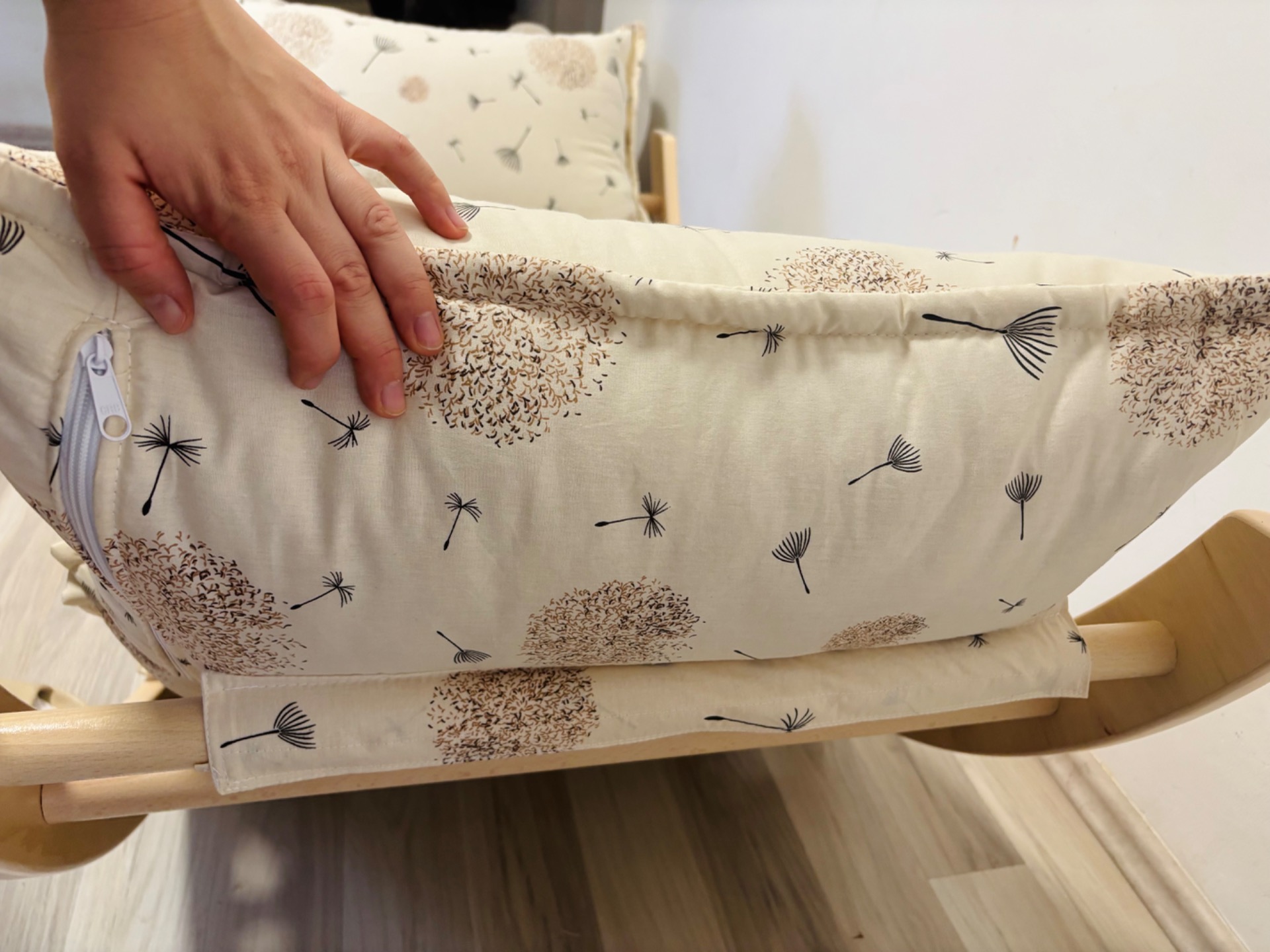 Felnőtt óriás hintába való vastag párna. Mindkét végen egy vastagabb párna résszel. Két rúdhoz tépőzárral lehet rácsatolni. Külső pamut huzata lecipzározható, mosógépben mosható, szárítható, vasalható.