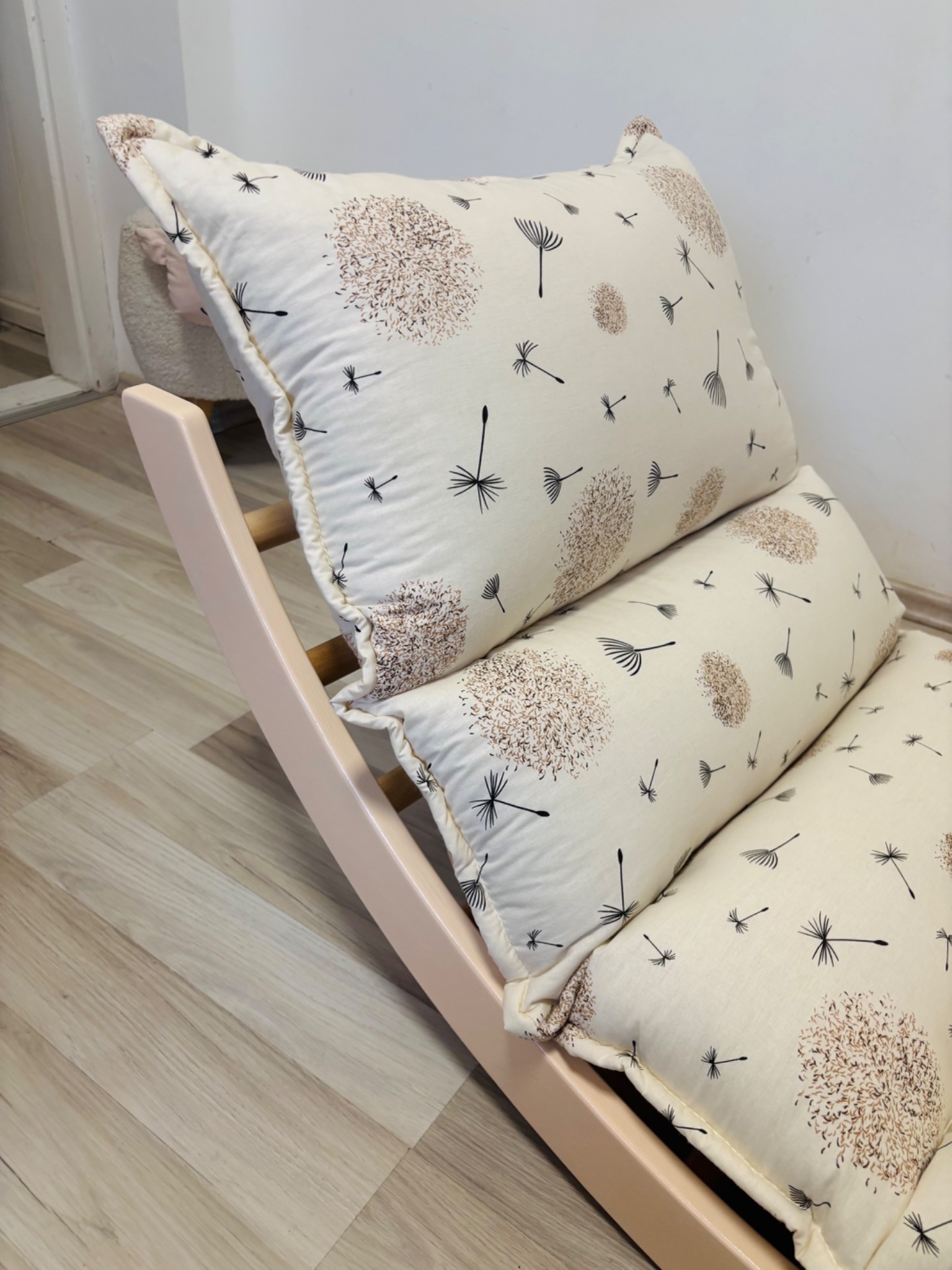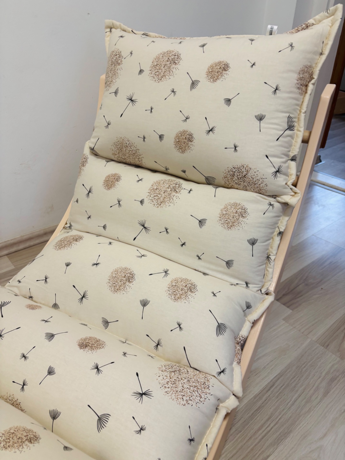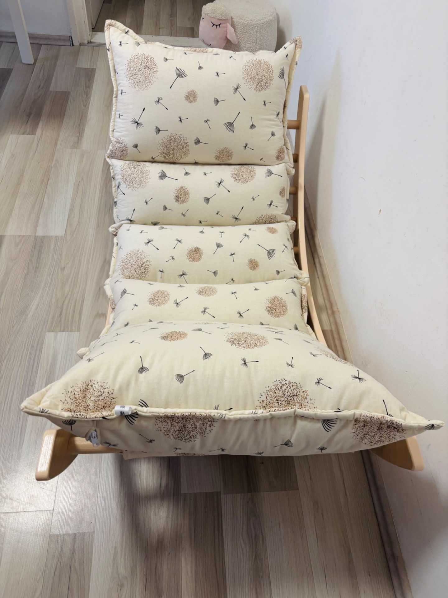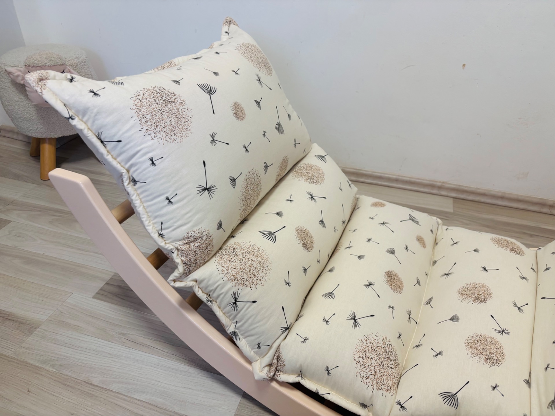 Felnőtt óriás hintába való vastag párna. Mindkét végen egy vastagabb párna résszel. Két rúdhoz tépőzárral lehet rácsatolni. Külső pamut huzata lecipzározható, mosógépben mosható, szárítható, vasalható.