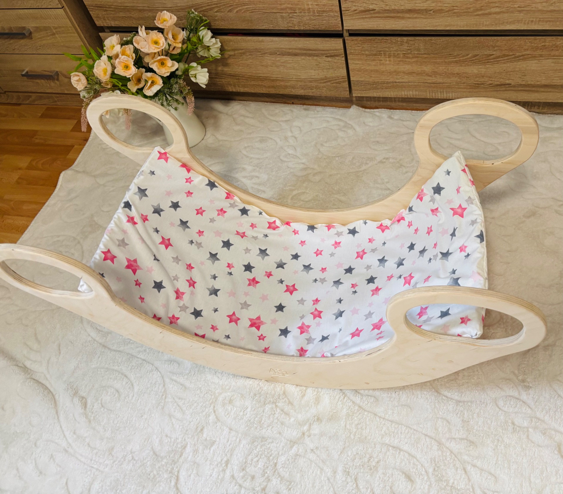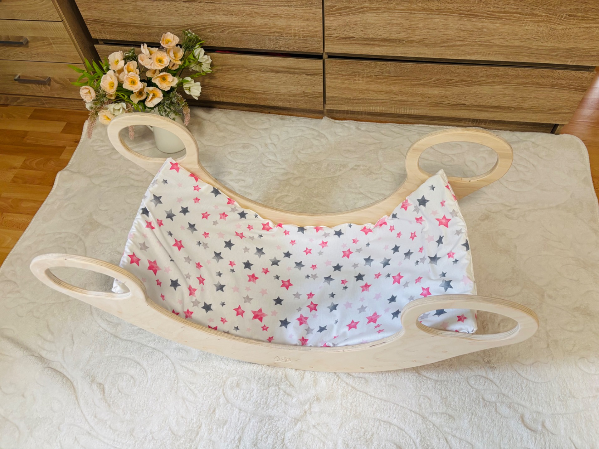 Pamutvászon anyagból készült,40 fokon mosógépben mosható, szárítógépben szárítható,vasalható,lecipzározható huzattal. 4 helyen odaköthető a hintához.