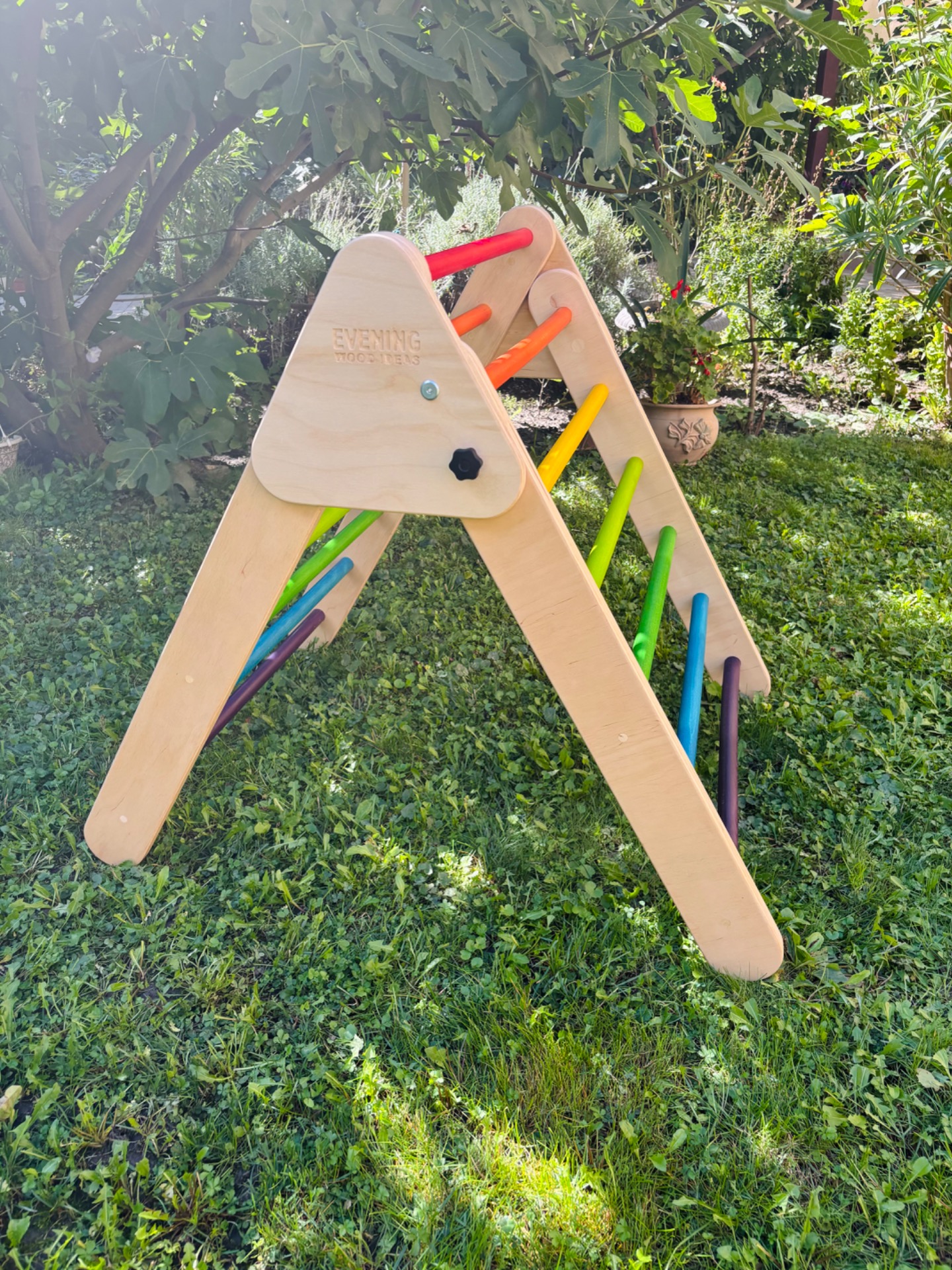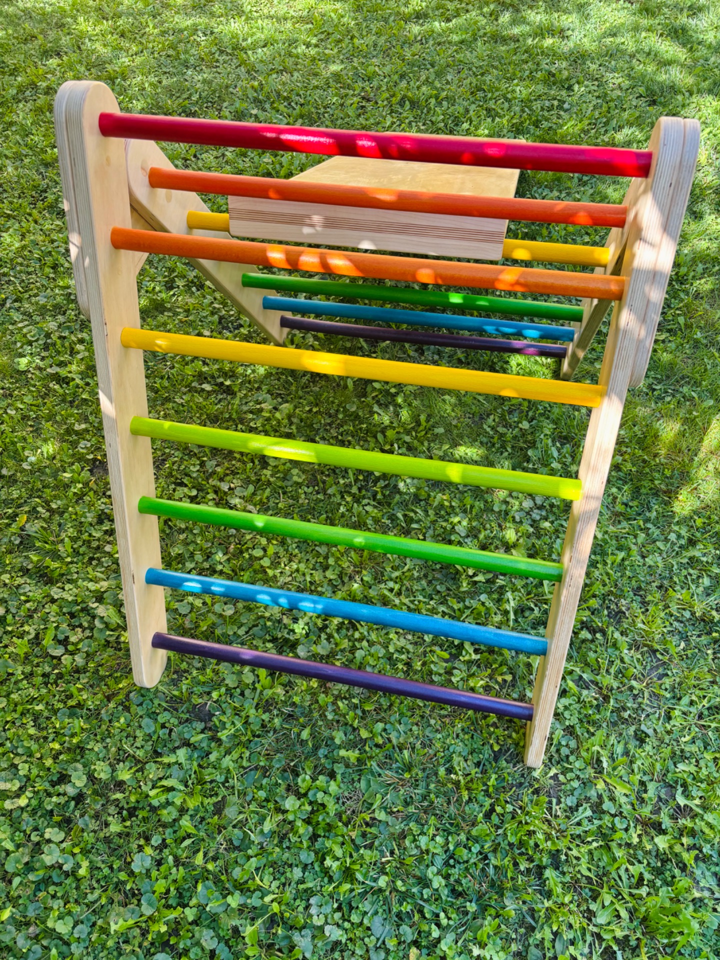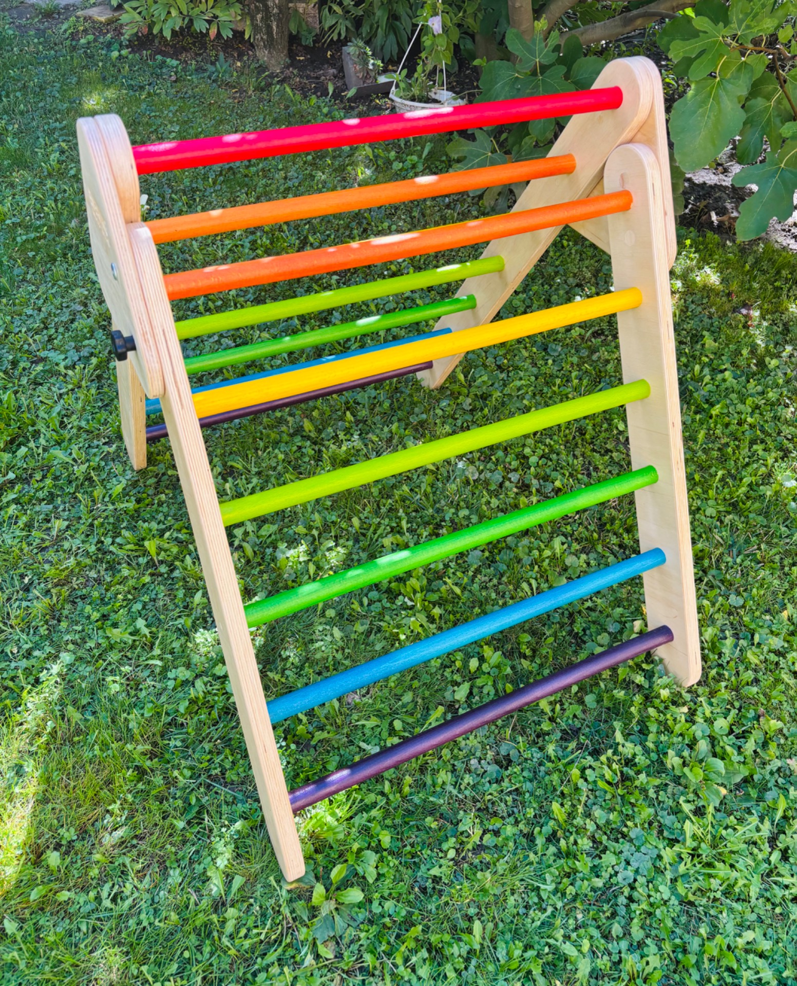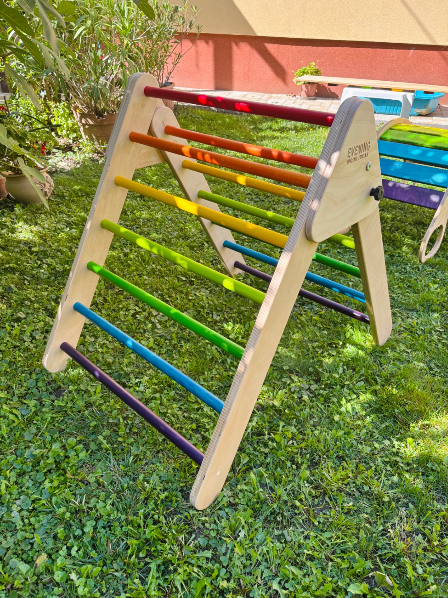 Igyekeztünk a megfelelő méretet (se túl magas - biztonság, se túl alacsony - csúszdázható) kikísérletezni és ötvözni a szemnek tetsző megjelenéssel. Összecsukható és az ágy alá betehető! A bükkfa rudakat bababarát festékkel és lakkal kezeltük. 10 hónapos kortól bevezethető, mert ebben a korban már a babák a mászóka lépcsőit használhatják felhúzásra és felállásra. Nagyjából 6 éves korukig érdekli őket. Segíti a gyerekeket, hogy saját tempójukban történjen a mozgásfejlődésük.