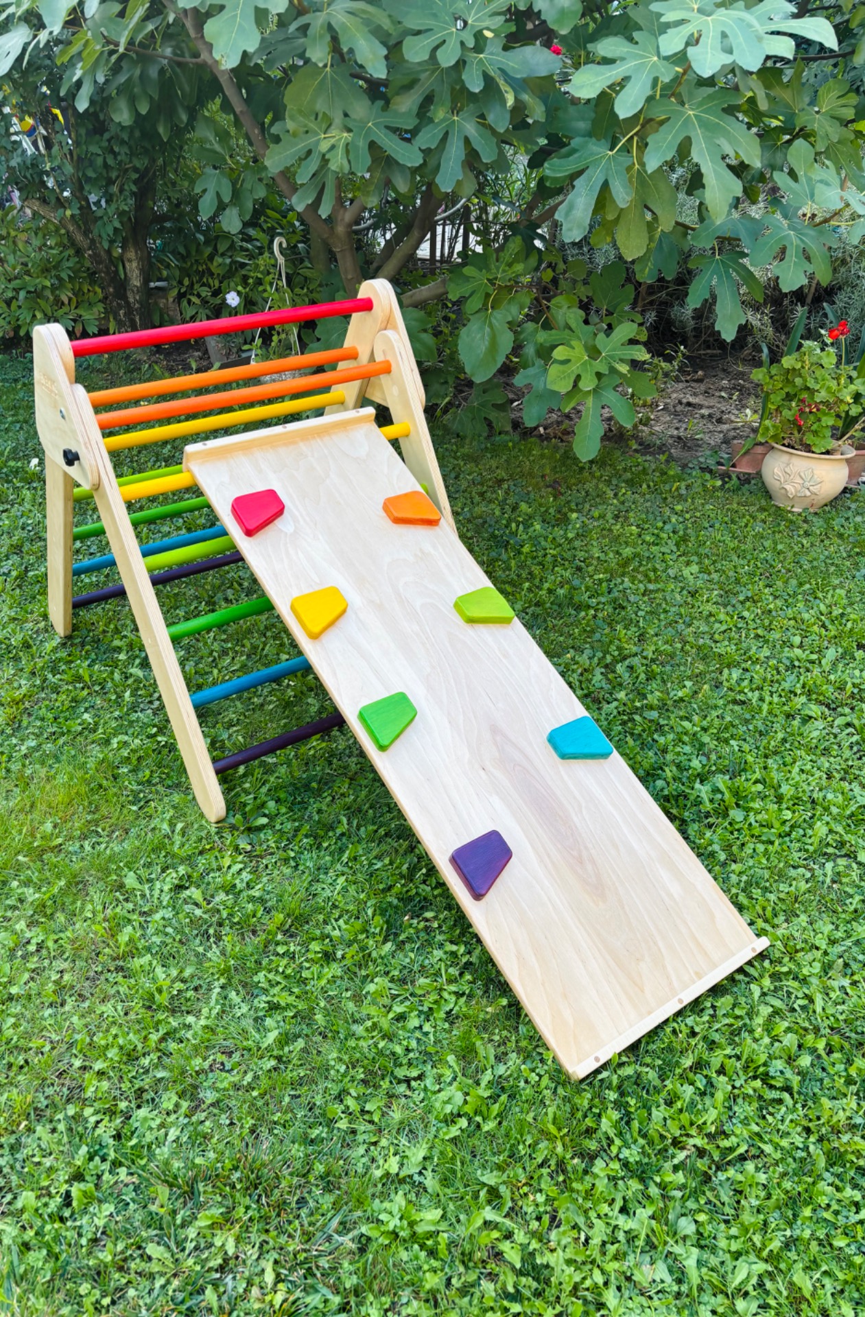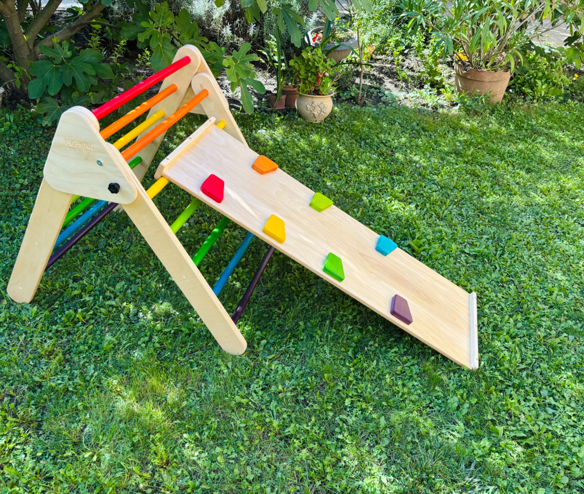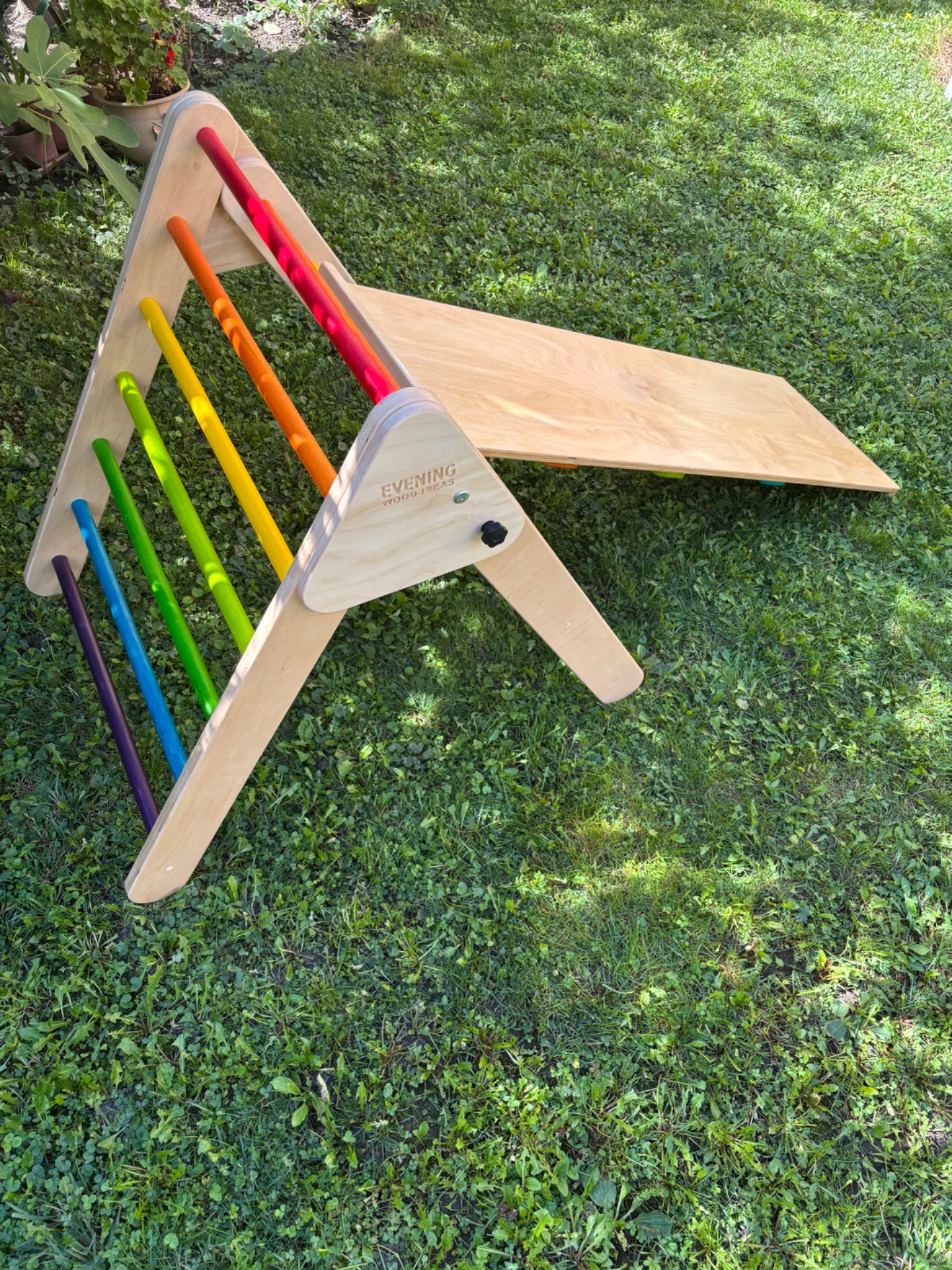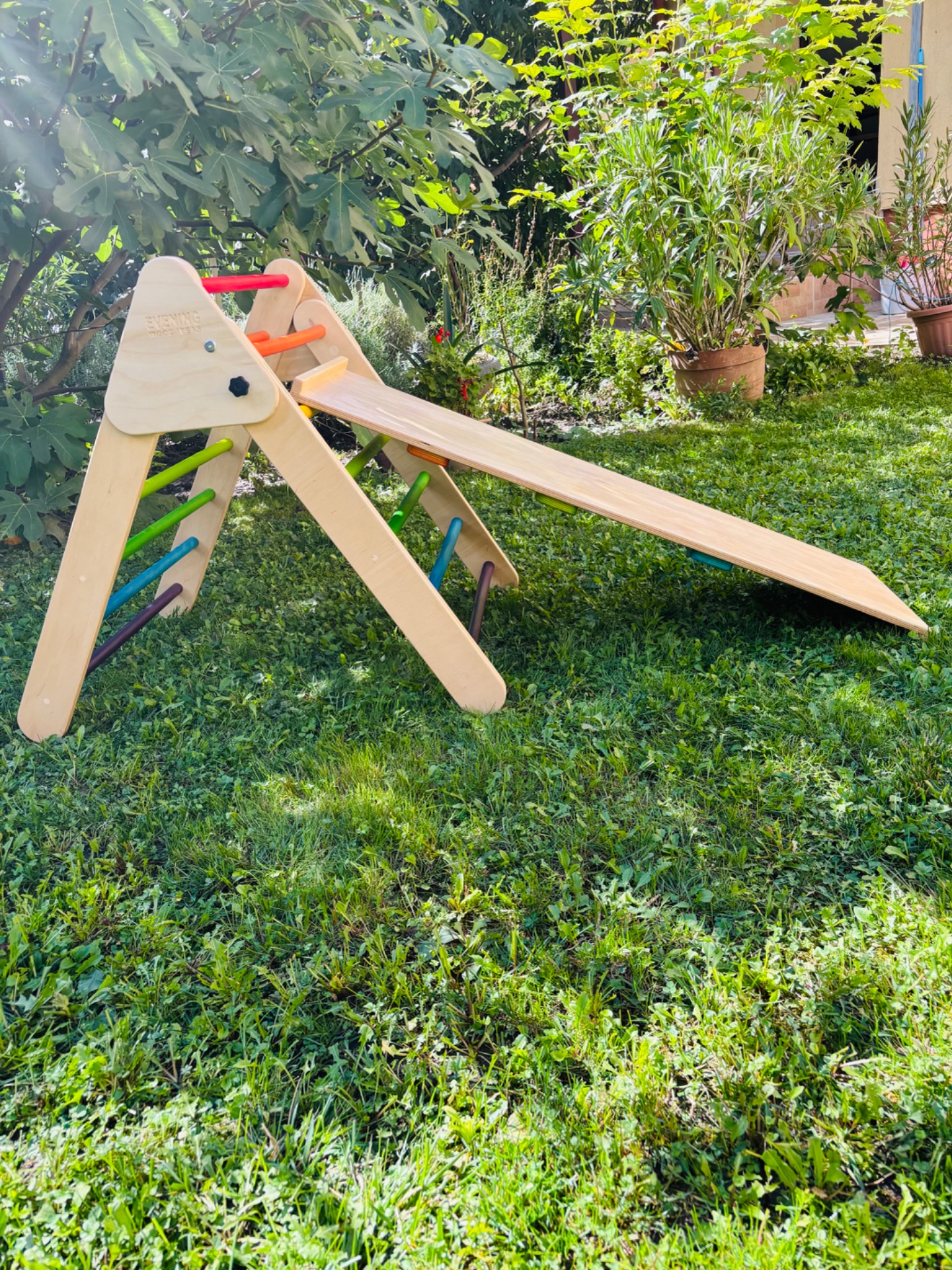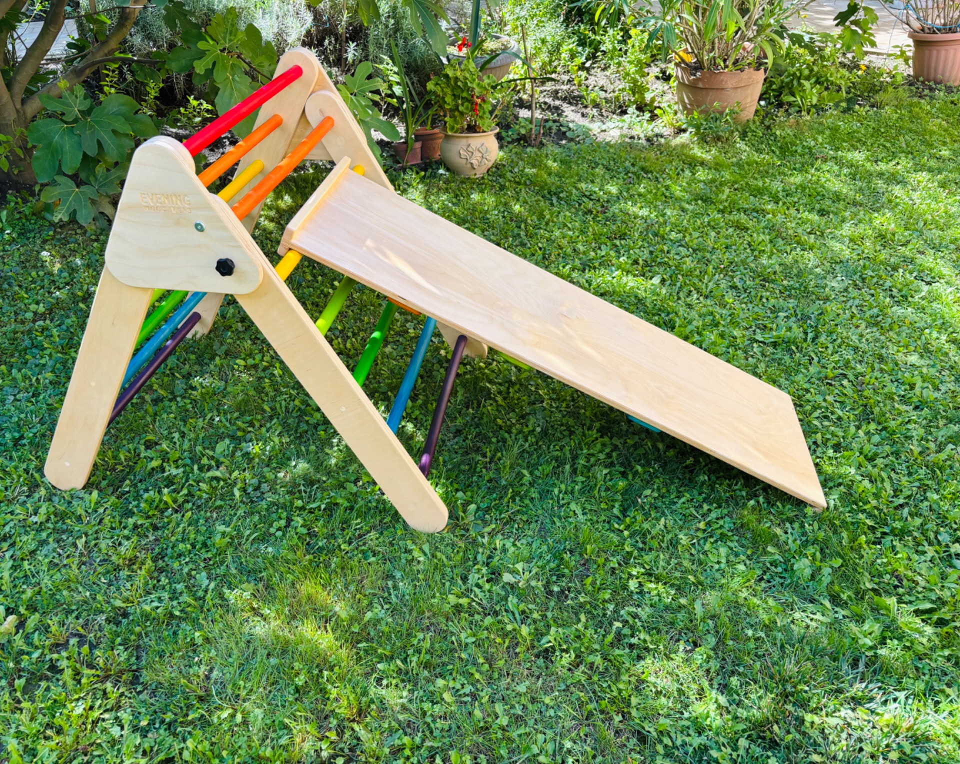 Igyekeztünk a megfelelő méretet (se túl magas - biztonság, se túl alacsony - csúszdázható) kikísérletezni és ötvözni a szemnek tetsző megjelenéssel. Összecsukható és az ágy alá betehető! A bükkfa rudakat bababarát festékkel és lakkal kezeltük. 10 hónapos kortól bevezethető, mert ebben a korban már a babák a mászóka lépcsőit használhatják felhúzásra és felállásra. Nagyjából 6 éves korukig érdekli őket. Segíti a gyerekeket, hogy saját tempójukban történjen a mozgásfejlődésük.
