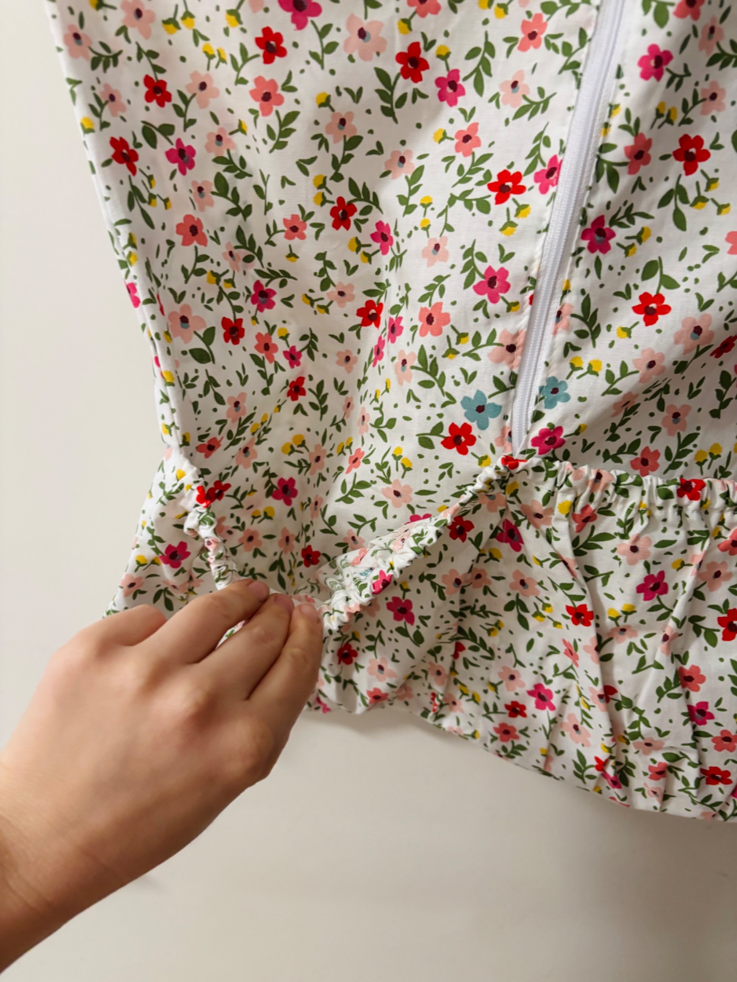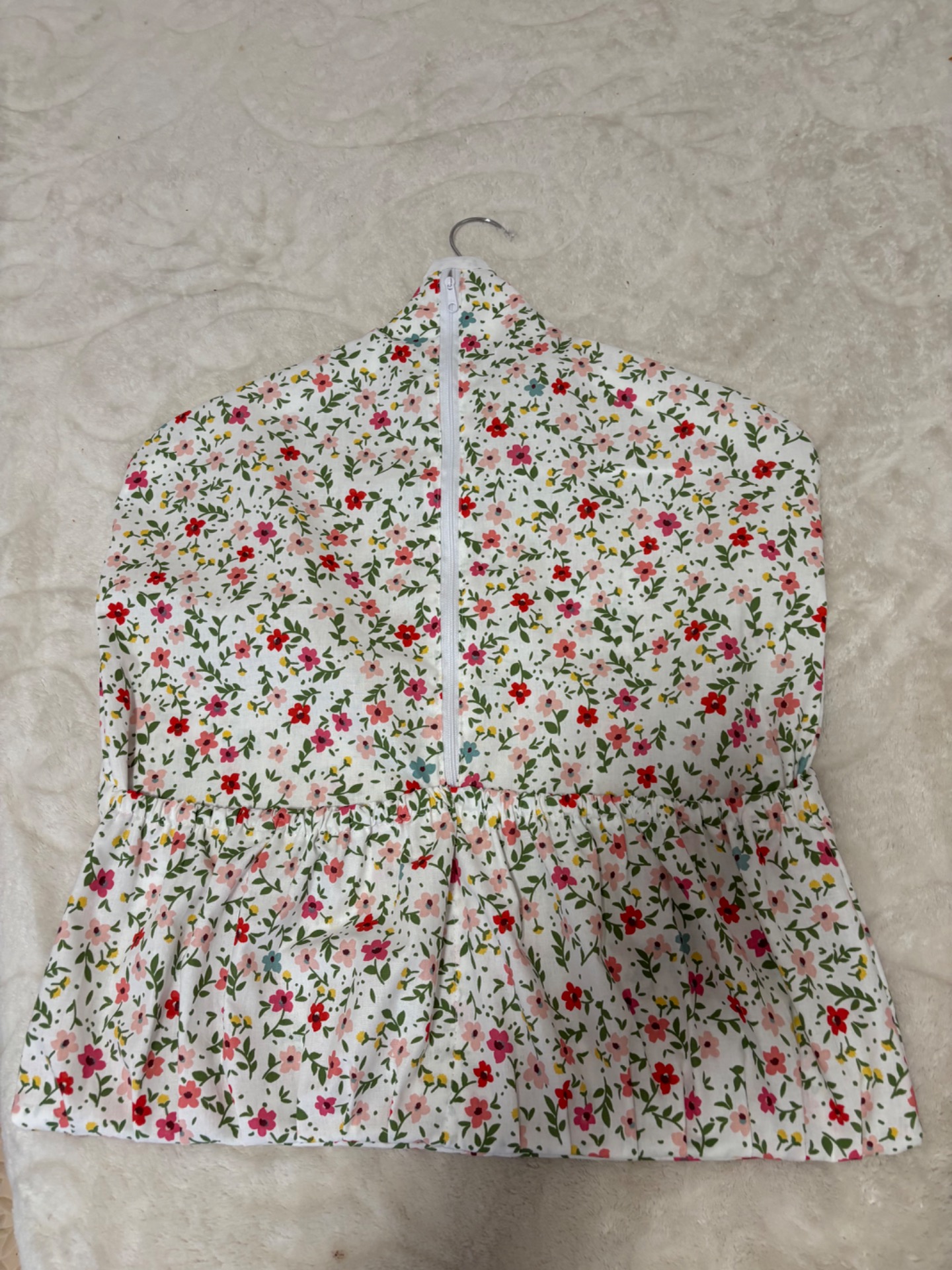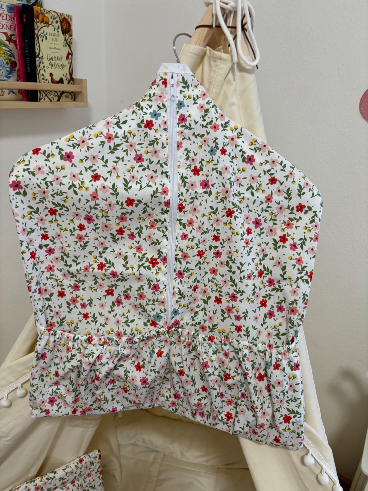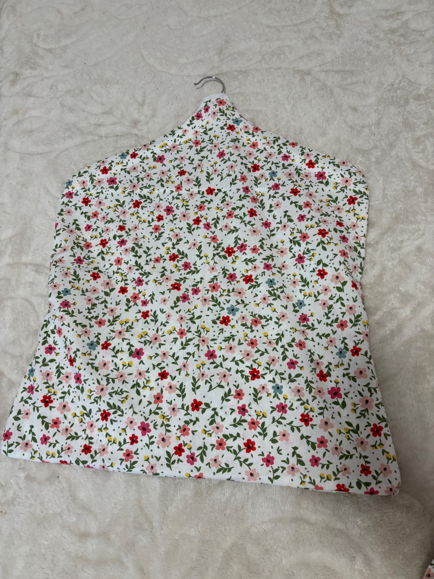 Pamut anyagból készül, elől cipzárral, két gumis zsebbel, vállfával.