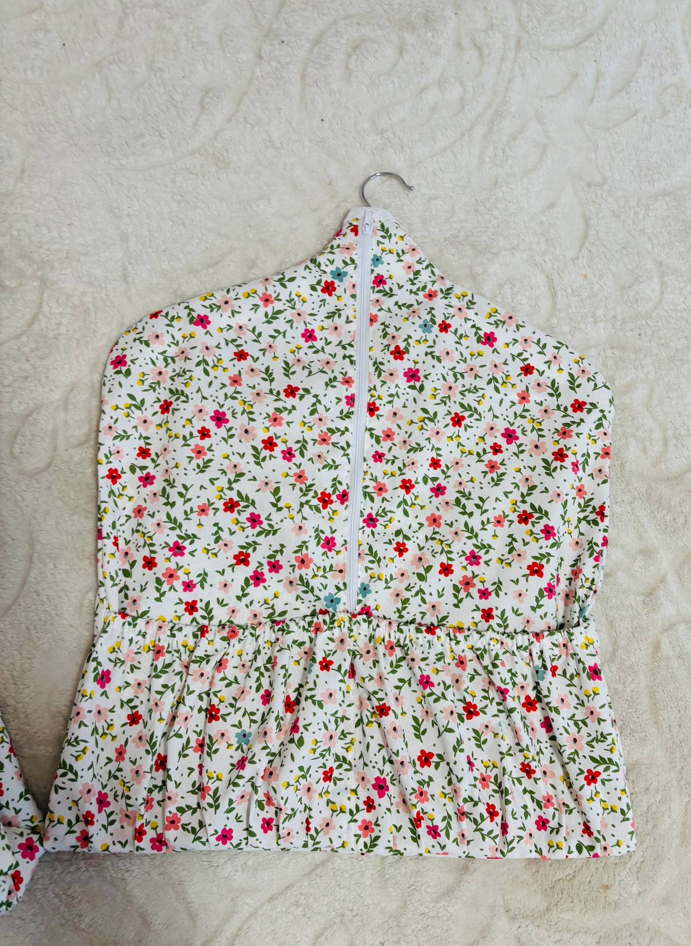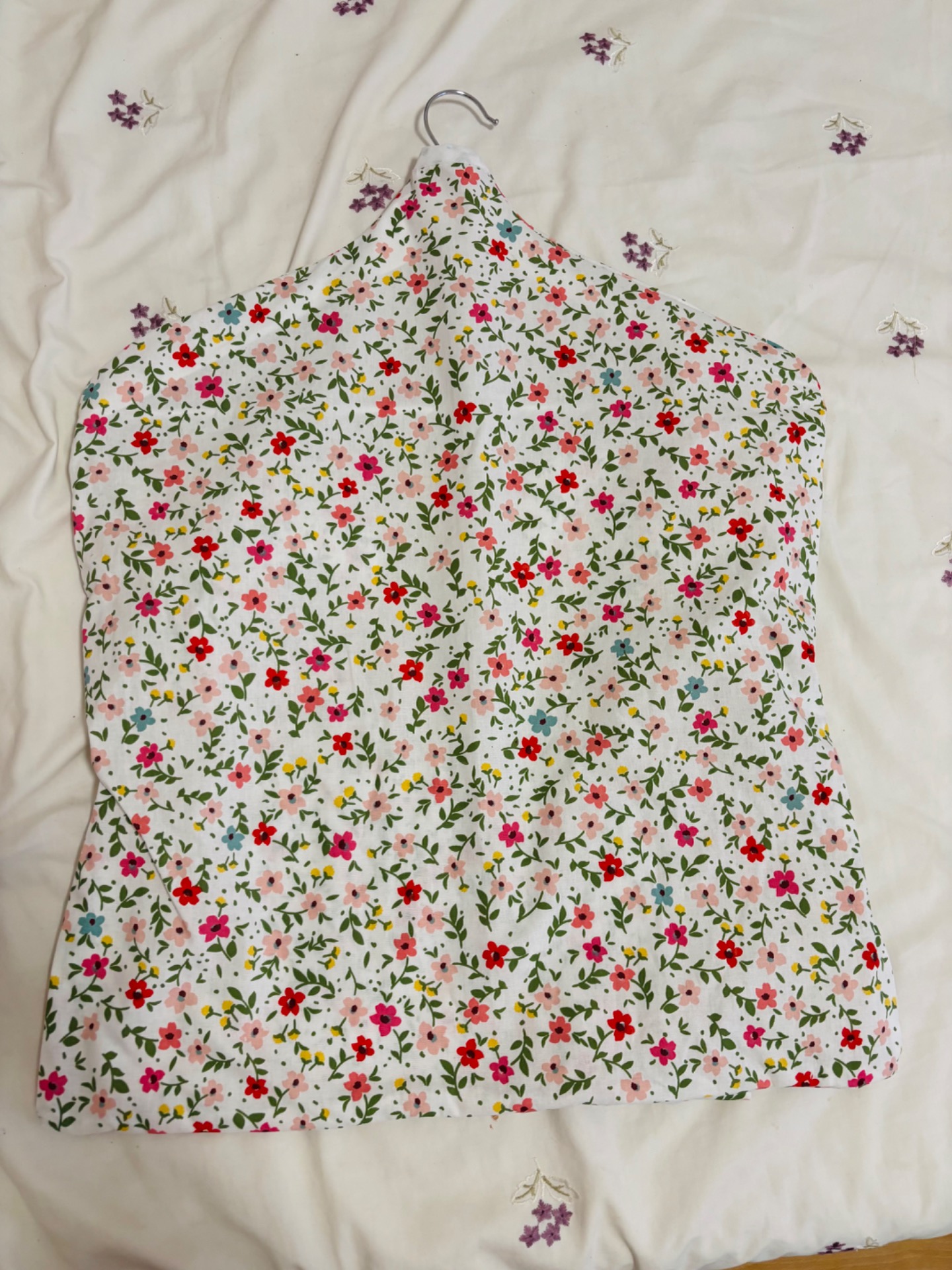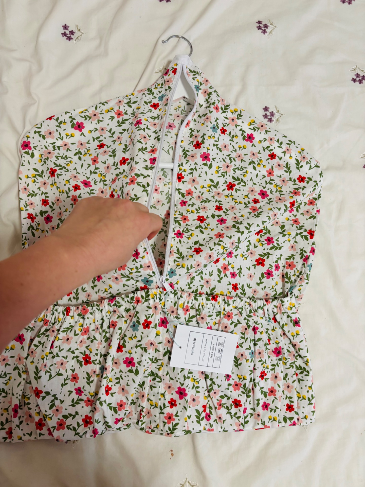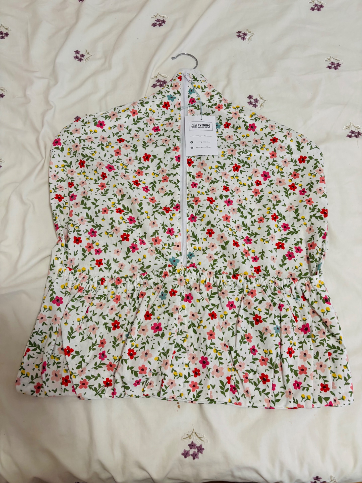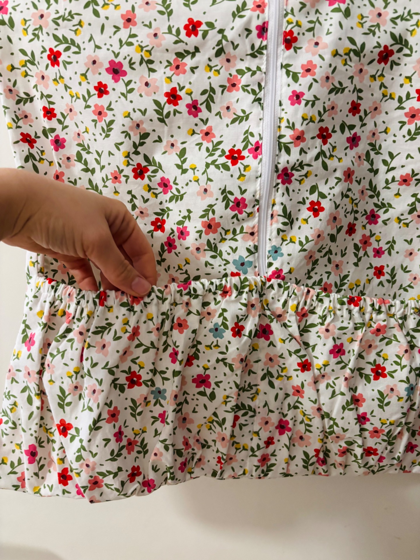 Pamut anyagból készül, elől cipzárral, két gumis zsebbel, vállfával.