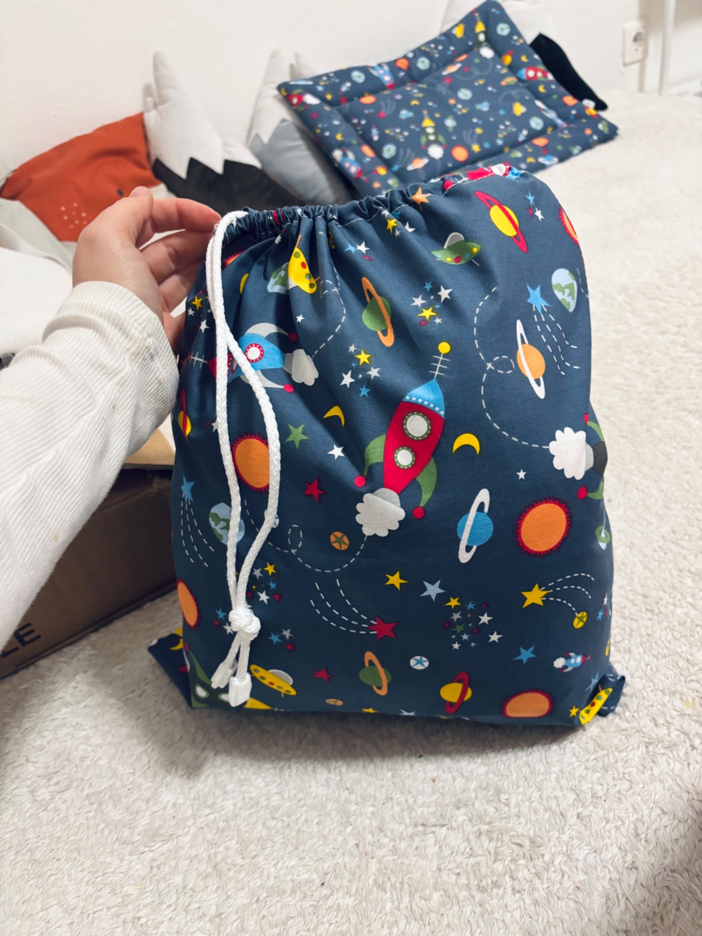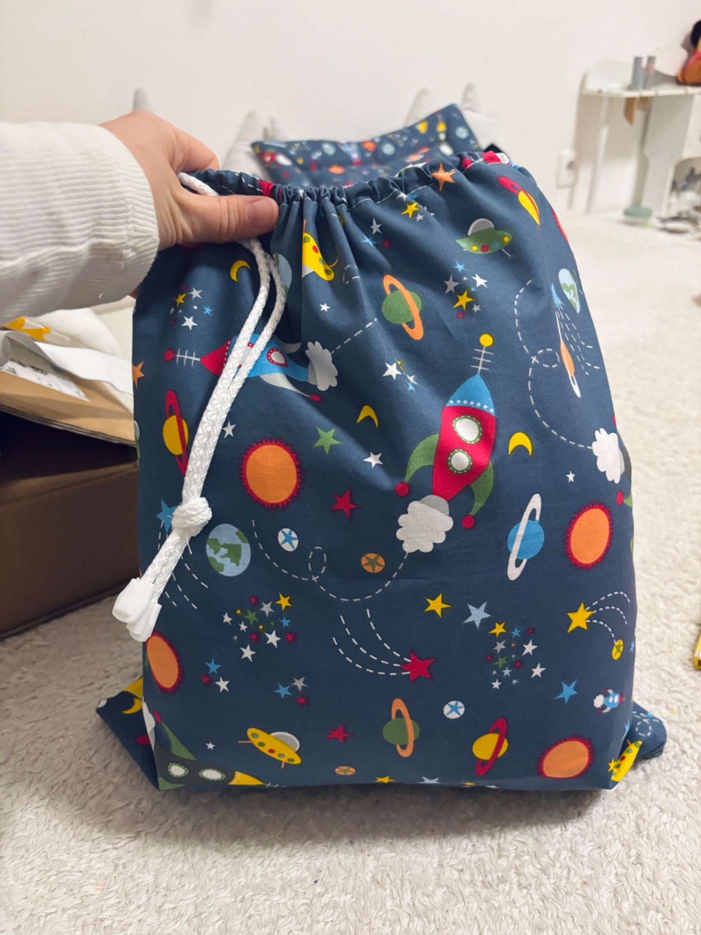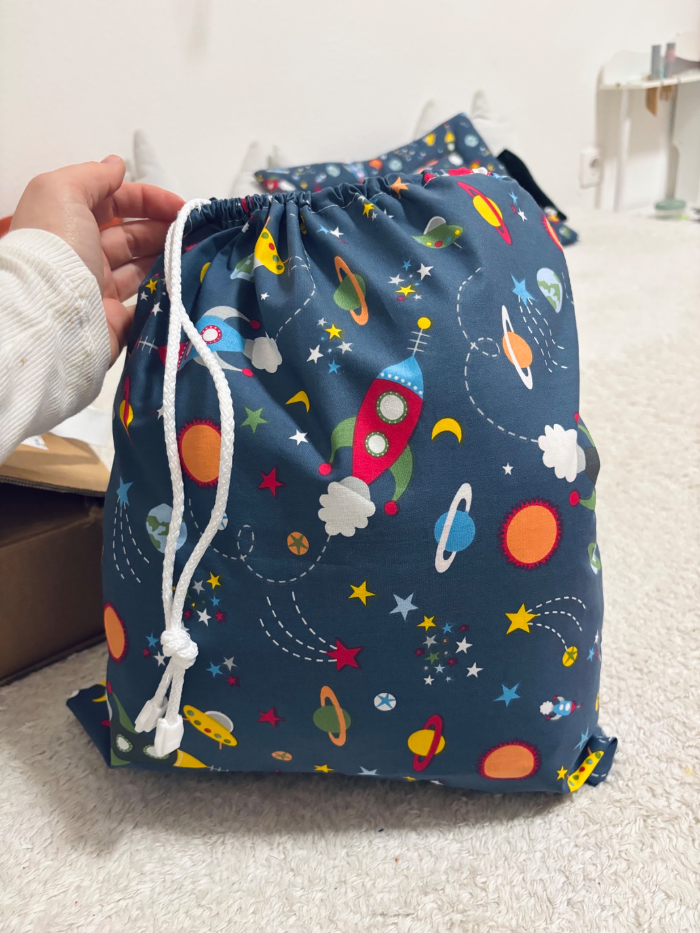 Pamutvászon anyagból készült, tetején húzózsinorral.