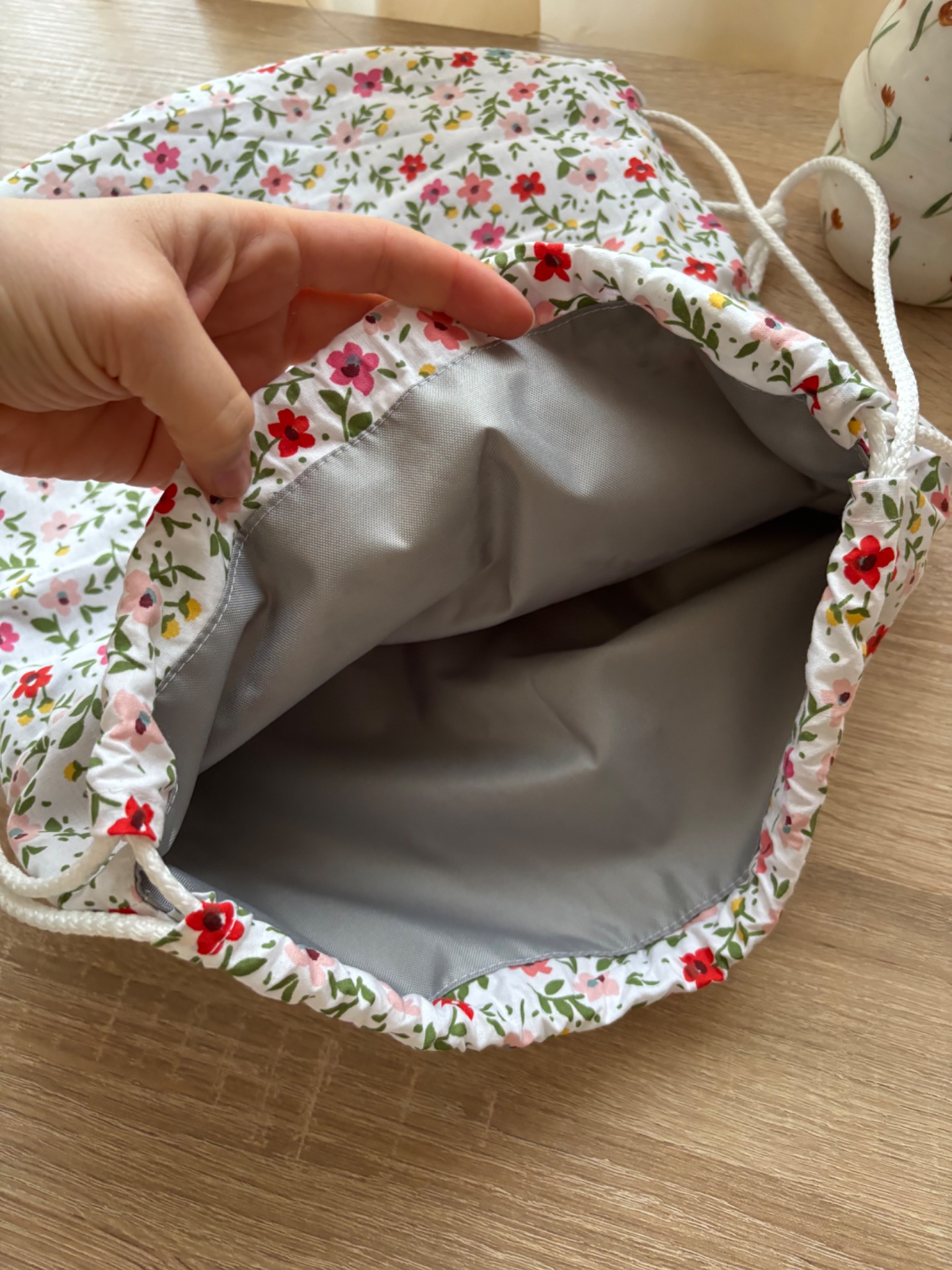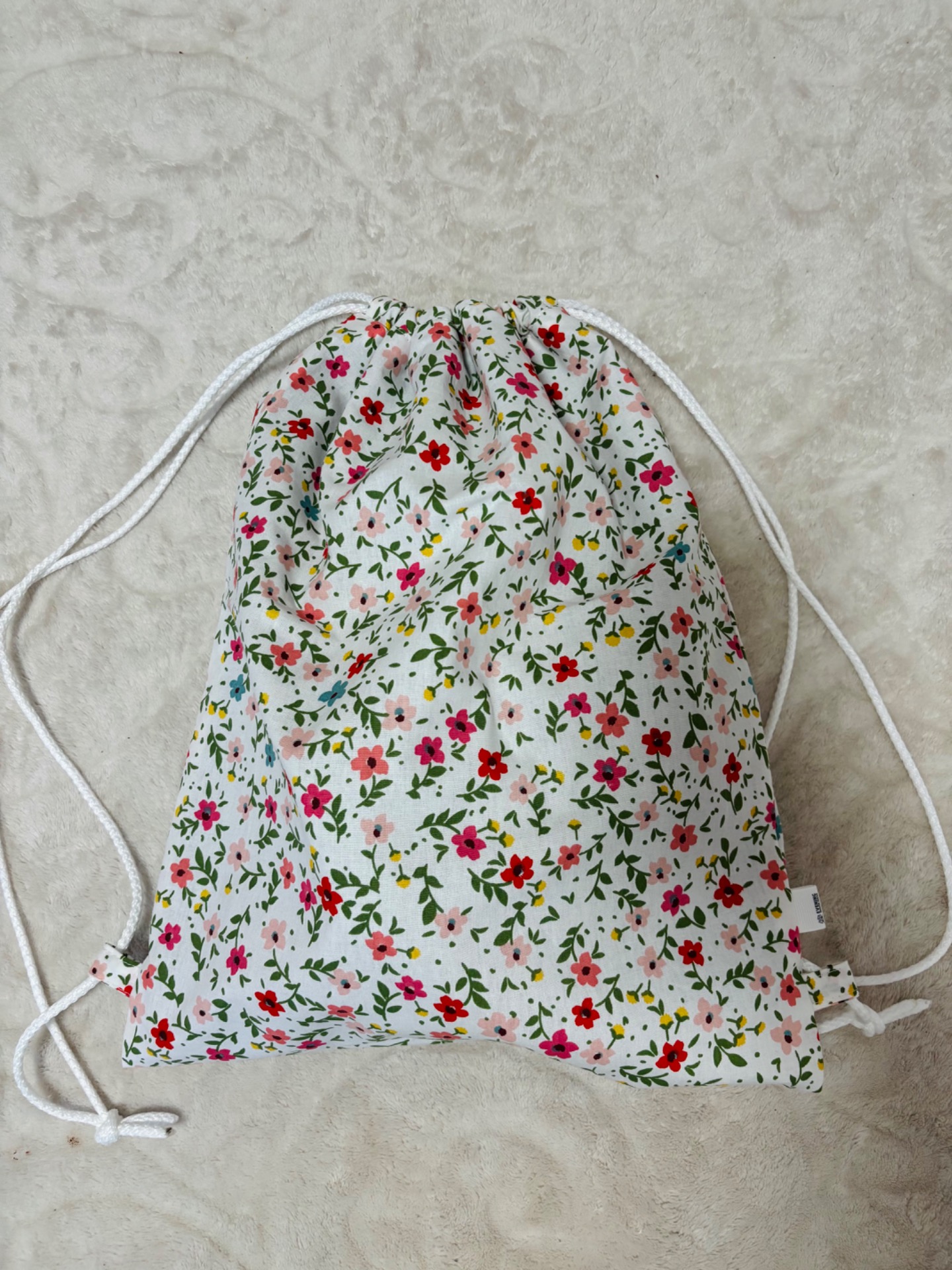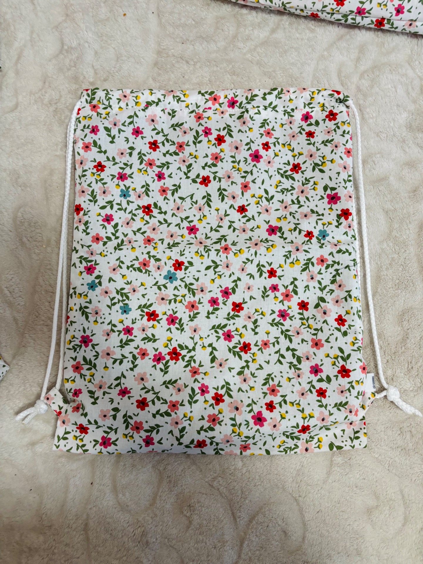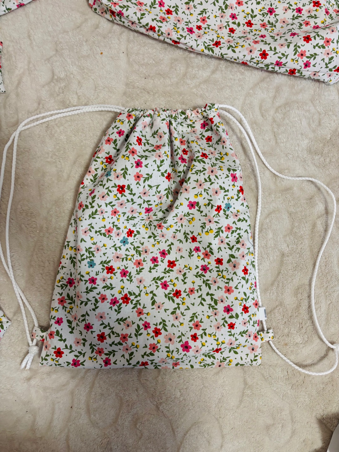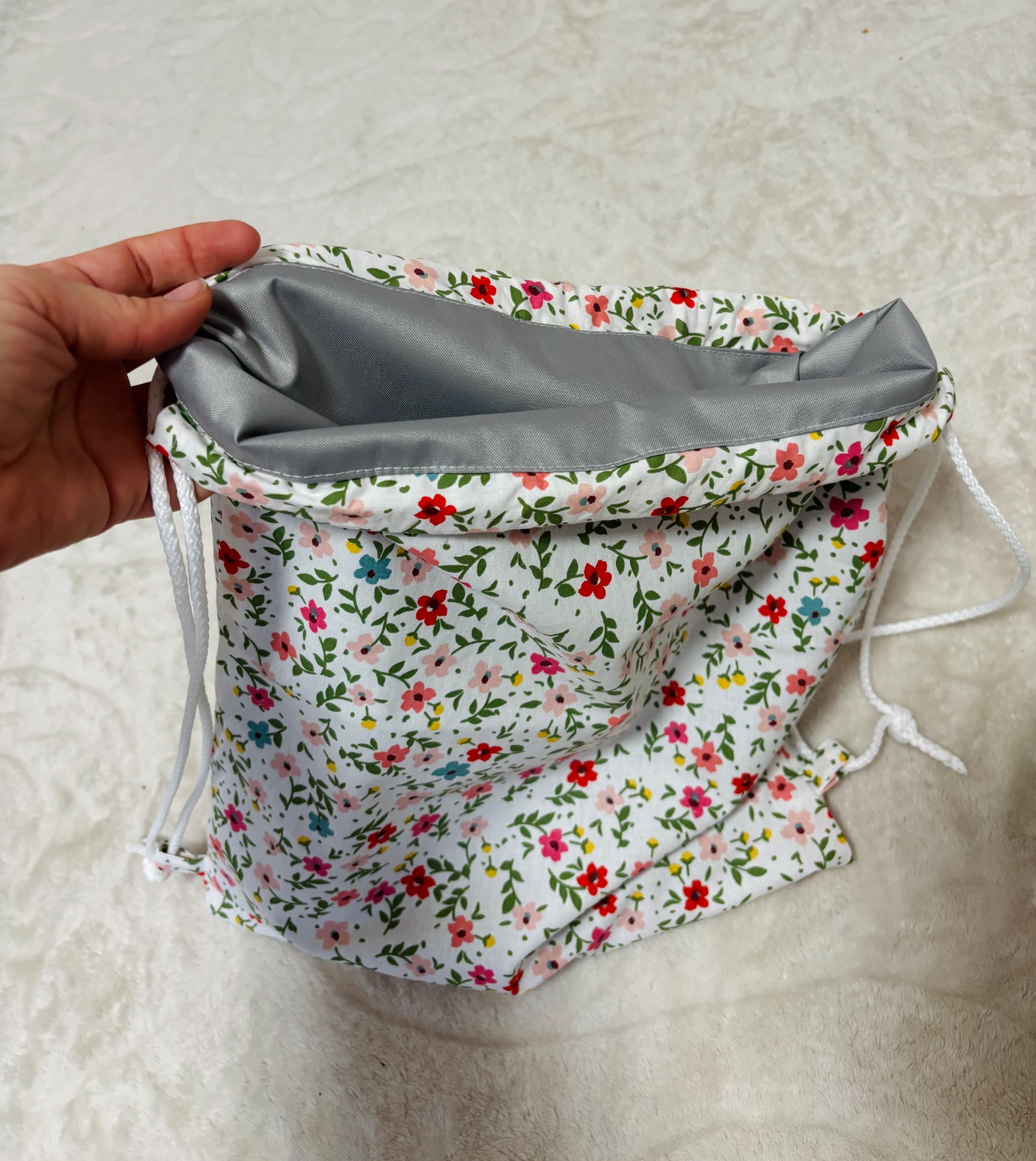 Pamutvászon anyagból készült, tetején húzózsinorral.Belseje vízhatlan bélésű.