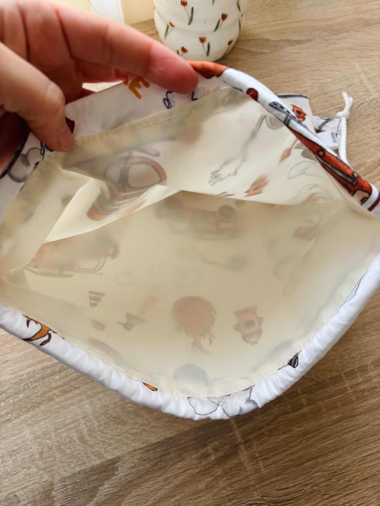 Pamut anyagból készült, belül vízhatlan béléssel.