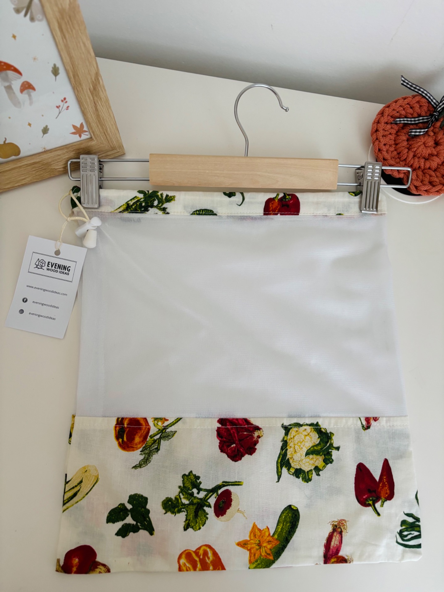 Pamutvászon és háló felhasználásával készült pillekönnyű , 2-3 gramm súlyú. Nagyon sokáig használható, mosógépben mosható, a pamutvászon része vasalható.